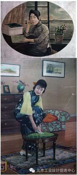 三幅图之间并没有既定的联系,分别出现于20世纪中国不同的历史时期,但它们似乎恰好与我们所说的“学习”、“拥抱”、“反思”三个阶段相对应,或许可以为我们阐释这种现代性发展的过程提供某种证明。图4是产生于 20 世纪初的一幅上海月份牌招贴画,当时这种绘画形式被广泛用于商品宣传,同时也在努力塑造一种新的视觉文化。画面描绘了一位沉思中的学习型女性形象,她打开窗户,凭窗阅读,呼吸着现代文明的新鲜空气,远 方有一艘驶向大海的轮船。她的面向与轮船驶去的方向一致,似乎在寓示一种寄情理想彼岸的精神出走。 不仅整个画面形象带有浓郁的时代气息,而且从“读书”的情节传递出一种新的时代风尚。从大海、轮船、新式书刊等图形符号的选取上也可以感受到一种对于正在出现的变化、对于不可知的“未来”的敏感追求。图 5 也是一幅上海月份牌招贴 画,产生于 20 世 纪 30 年代,比图 4 稍晚。画面 中 是一位满怀欣喜走 向现代生活的时尚妇人。她笑态嫣然穿着新式皮鞋准 备盛装出行,发式是时新的又是东方的,服装是新款的又是江南的;她身后的墙壁上挂着镶在新式镜框中 的风景画,衣柜上搁着用红木作底座的花插,墙边是洋气的沙发与现代的地板,脚下踩着西式的脚凳和传 统风格的地毯……似乎一切都表明:时尚的西洋文明不仅为精英文化层的精神出走所拥有,它甚至已经成 为普通市民拥抱生活、享受生活的形式象征。