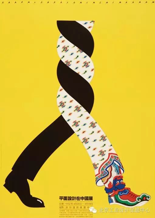 图6 则完成于接近世纪末的1992 年,在中国改革开放的前沿城市深圳,由新锐设计师陈绍华设计。画面上已经完全没有了20 世纪初所洋溢的那种轻松 与愉悦,而只有交错纠缠、蹒跚而行的两条腿,一条腿西服革履,应当是“现代”的象征;一条腿戏装绣鞋,应当代表着“传统”;两条腿组成一个汉字“人” 形。这是一个在不安与焦虑中迈向未来的“现代中国”的隐喻。它表明:“传统还是现代”、“东方还是西方”这两大世纪提问不仅结为一体、交错纠缠,并且已经形成对中国社会及文化主体性的深刻困扰,它几乎就是一个世纪以来笼罩着中国变革进程的那种精神状态 的真实写照。
