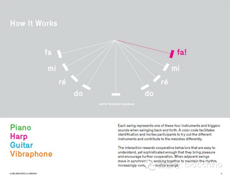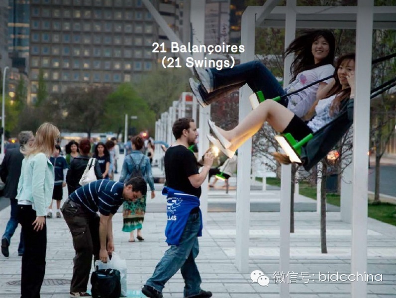 加拿大蒙特利尔的设计团队“同一天”(Daily tous les jours),凭借其融合音乐与空间设计的公众健身娱乐设施“21 Swings”,赢下3万美元的头奖。21音乐秋千作为城市复苏项目的一部分,既是公共用地里可以娱乐嬉戏的场所,也是巨大的合作乐器。评委们认为,当这些秋千全部一起运作起来,秋千所发出的音符就能够构成一首美妙的乐章,这个乐器能激发人们对公共用地的使用想法,在城市中央为人们提供了一个如此有活泼生机的场所。