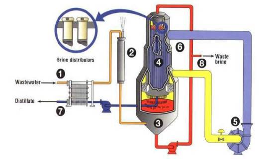 运作过程中所消耗的,仅是驱动蒸发器内废水、蒸汽、和冷凝水循环和流动的水泵、蒸汽泵和控制系统所消耗的电能。为了抵抗废水对蒸发器的腐蚀,保证设备的使用寿命蒸发器的主体和内部的换热管,通常用高级钛合金制造。其使用寿命30年或以上。
