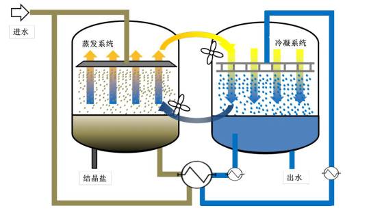 废水首先经过换热器被加热至一定温度(40~80oC),然后进入蒸发系统,水分蒸发形成水蒸汽,在循环风的作用下被移至冷凝系统,含有饱和水蒸气的热空气与冷凝系统内的冷水(20~50oC)相遇而凝结成水滴,并被输送至系统外。经蒸发后的废水浓度不断升 高,达到饱和溶解度的盐从溶液中析出形成固体颗粒,并最终从水中分离出去。