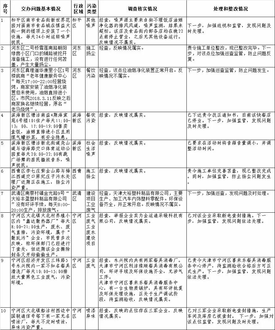 截至2018年4月28日12时,我市推进环境保护突出问题整改落实办公室共转办群众信访举报件5274件。其中:滨海新区784件、和平区183件、河东区375件、河西区341件、南开区399件、河北区288件、红桥区169件、东丽区265件、西青区343件、津南区323件、北辰区384件、武清区253件、宝坻区285件、宁河区238件、静海区329件、蓟州区302件、海河教育园区6件,市水务局2件、市市容园林委2件、市交通运输委2件、市国资委1件。现将部分信访举报件办理情况公布如下: