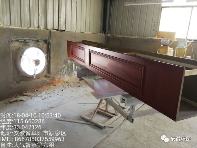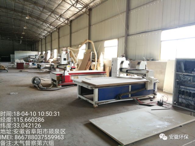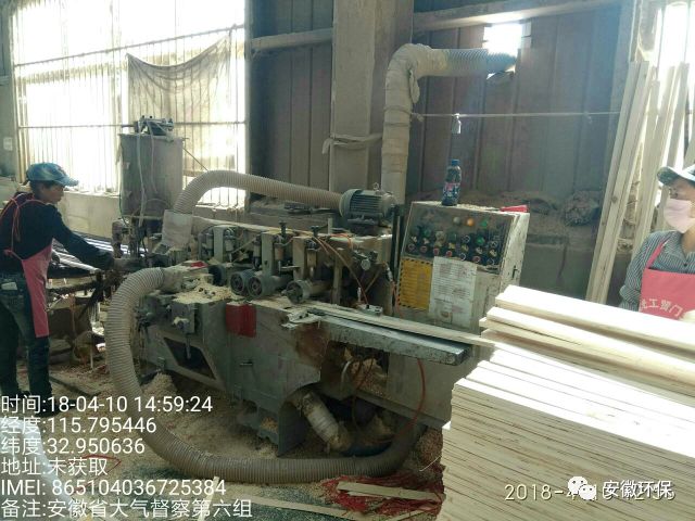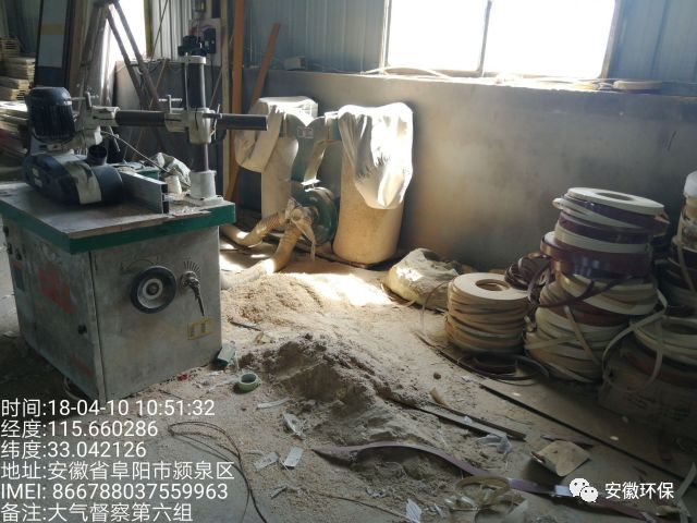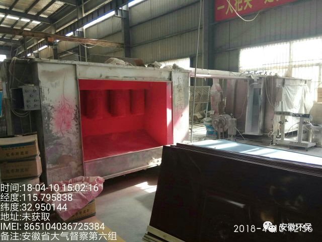 车间内板材切割机无收尘装置,车间外板材切割机布袋收尘装置布袋破损严重,刨花机粉尘收集后直排;配料车间无粉尘收集、处理设施,无组织排放严重;环评中无喷塑工序,喷塑系统封闭不严,粉尘跑冒滴漏严重;转印机采用生产下脚料作为燃料且无废气处理设施;废吨桶露天摆放;环境影响评价文件无烘干工序,现场检查有烘干炉一台。