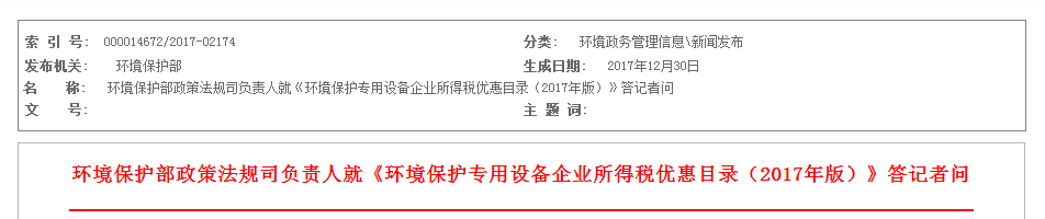 2017年9月,经国务院同意,财政部、国家税务总局、环境保护部等5部门联合公布《关于印发节能节水和环境保护专用设备企业所得税优惠目录(2017年版)的通知》,自2017年1月1日起施行。《环境保护专用设备企业所得税优惠目录(2017年版)》(以下简称《设备优惠目录》)是该项税收优惠政策的重要内容。由于我国企业所得税是按自然年度核算的,2017年度的企业所得税将在2018年缴纳,所以,从2018年开始,符合规定的企业将从这项绿色税收中获得直接的经济效益。就《设备优惠目录》有关问题,环境保护部政策法规司负责人回答了记者提问。