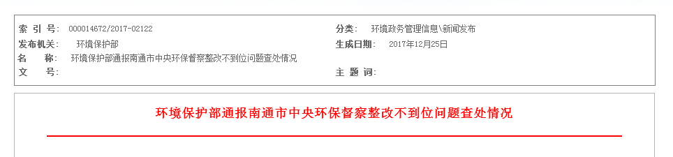 环境保护部通报南通市中央环保督察整改不到位问题查处情况