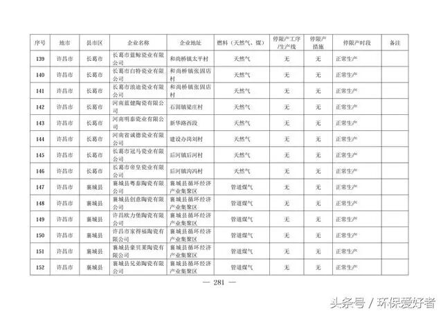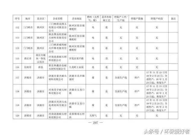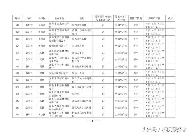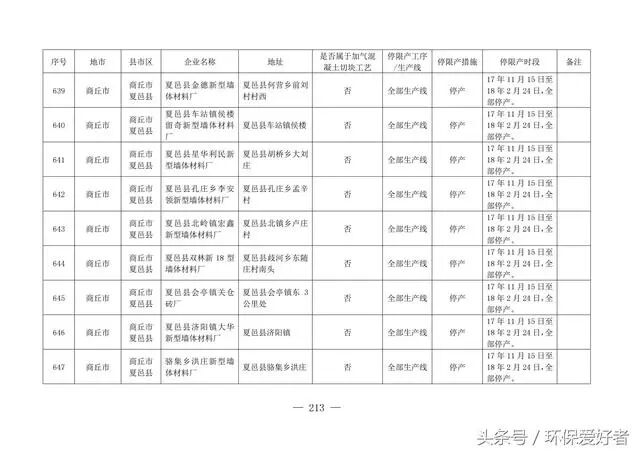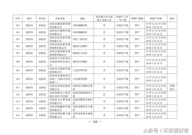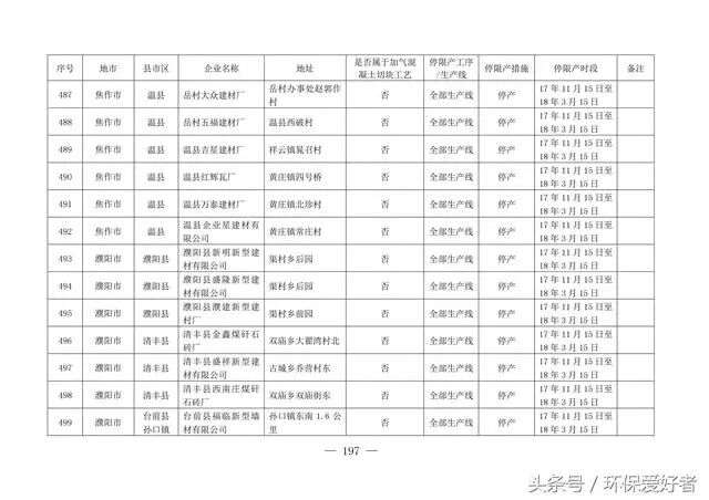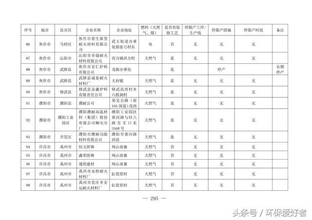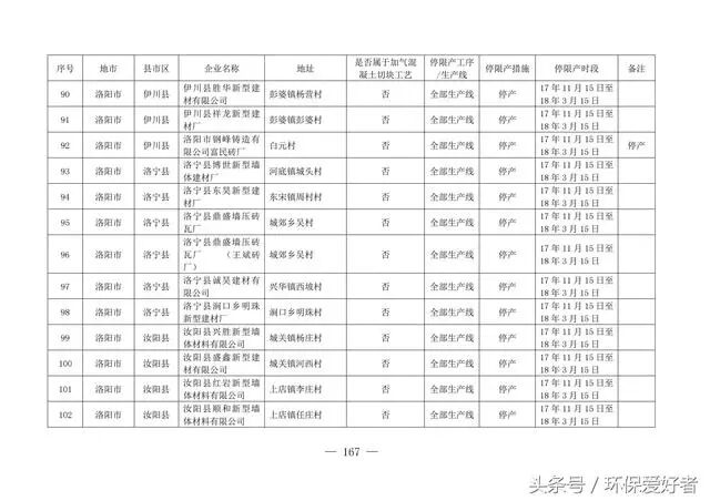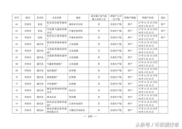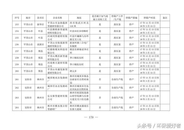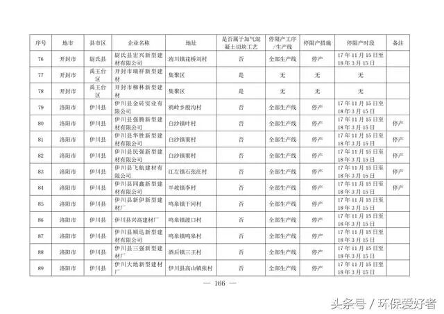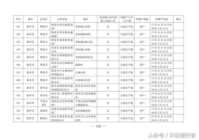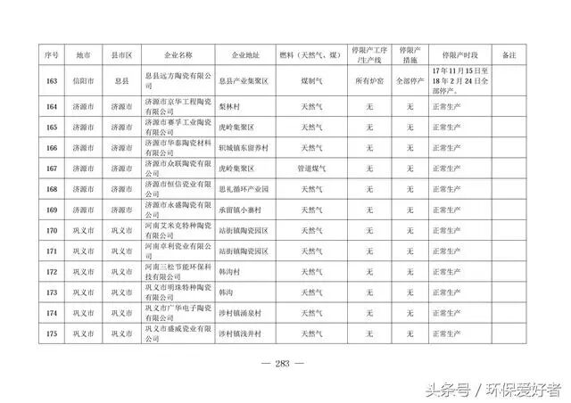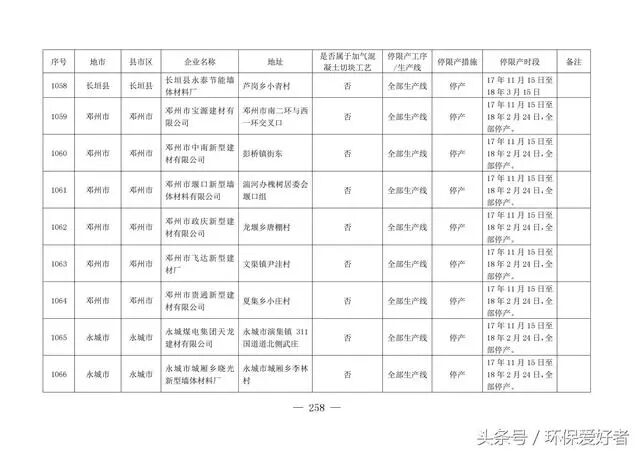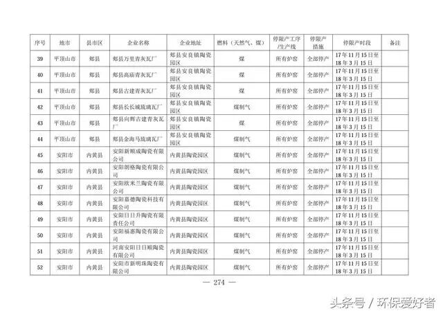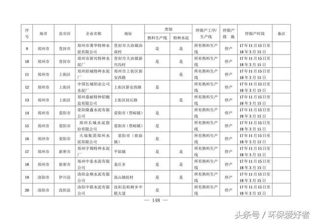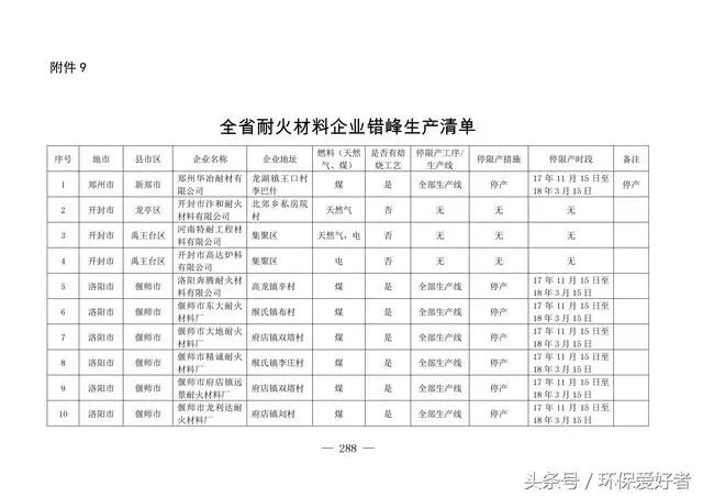 1.郑州市、开封市、安阳市、鹤壁市、新乡市、焦作市、濮阳市、巩义市、兰考县、滑县、长垣县等京津冀大气污染传输通道城市和洛阳市、平顶山市行政区域内的50家水泥、545家砖瓦窑、47家陶瓷、2家岩棉、6家石膏板、23家耐材企业,2017年11月15日至2018年3月15日,全部停产。