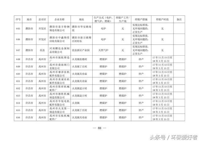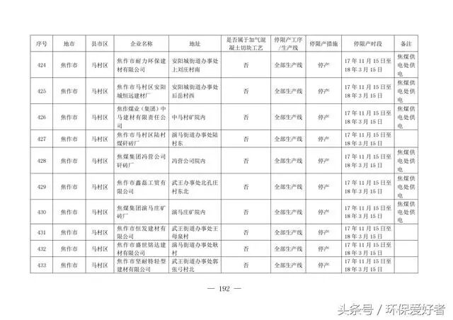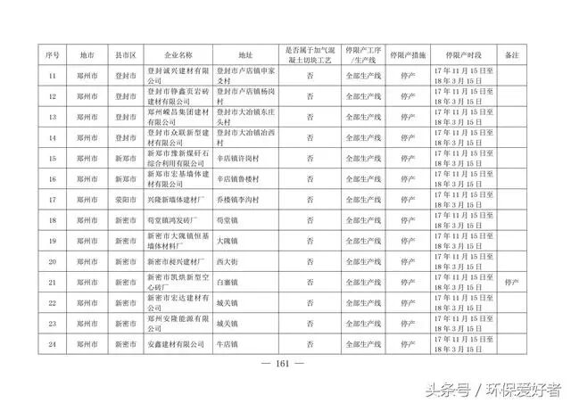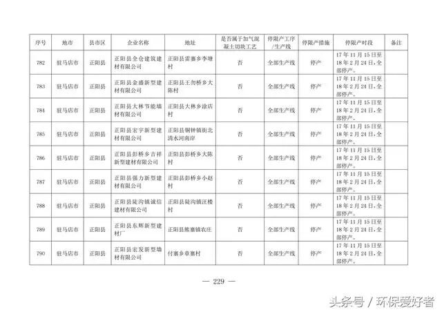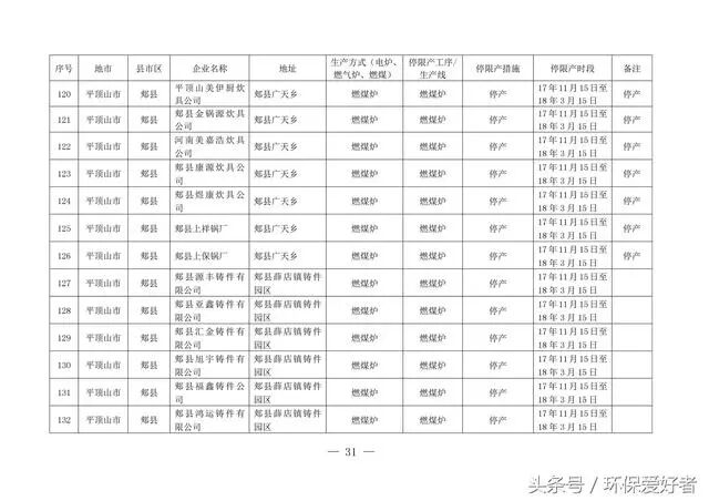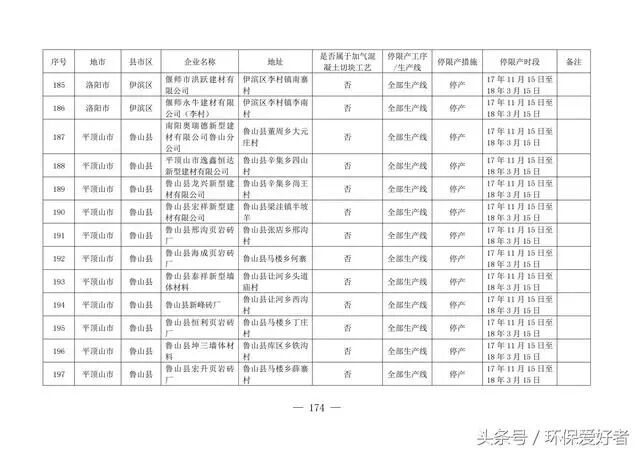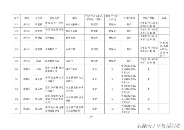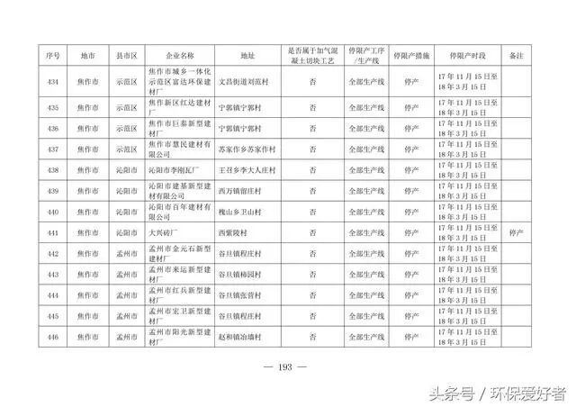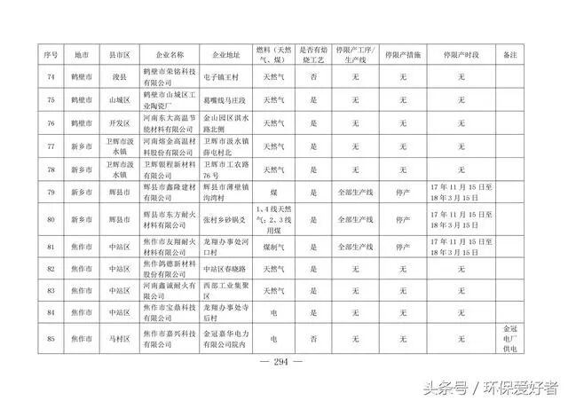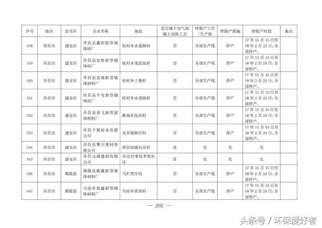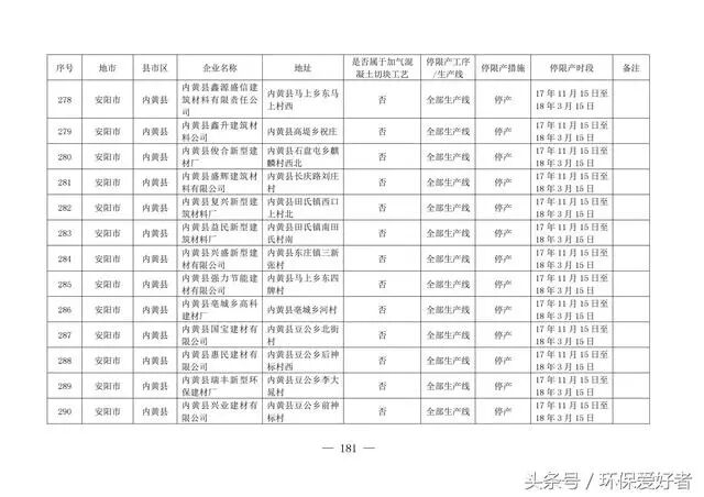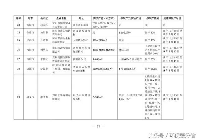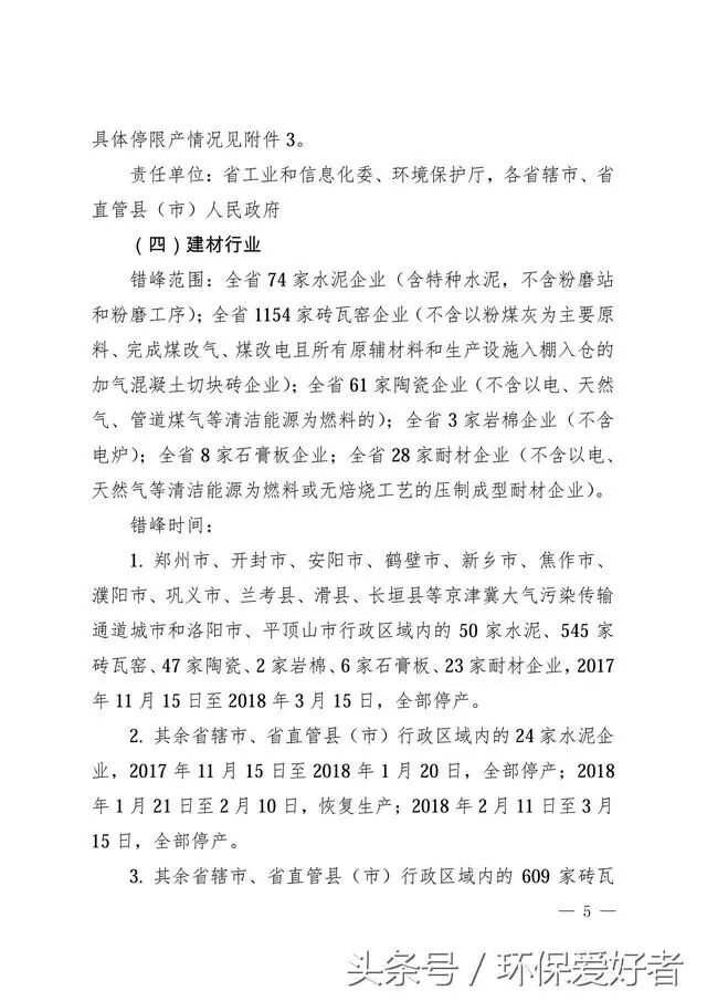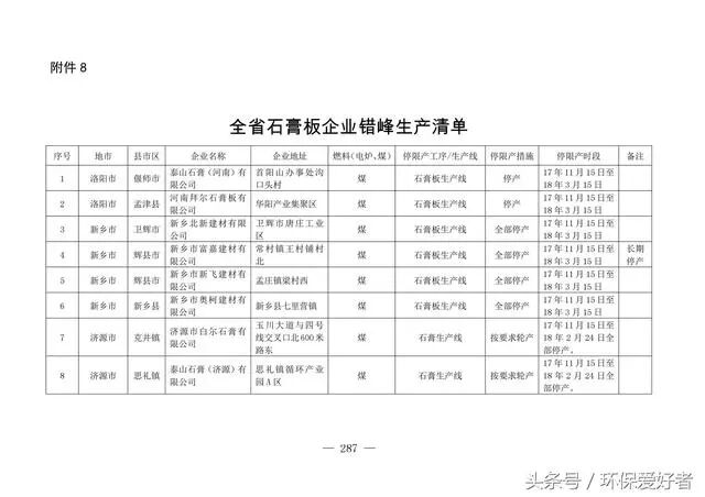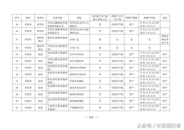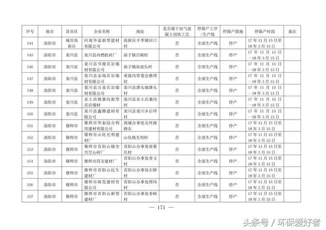 1.郑州市、开封市、安阳市、鹤壁市、新乡市、焦作市、濮阳市、巩义市、兰考县、滑县、长垣县等京津冀大气污染传输通道城市和洛阳市、平顶山市行政区域内的50家水泥、545家砖瓦窑、47家陶瓷、2家岩棉、6家石膏板、23家耐材企业,2017年11月15日至2018年3月15日,全部停产。