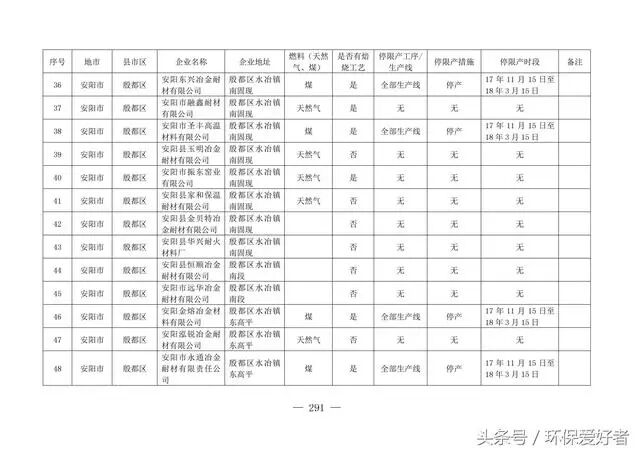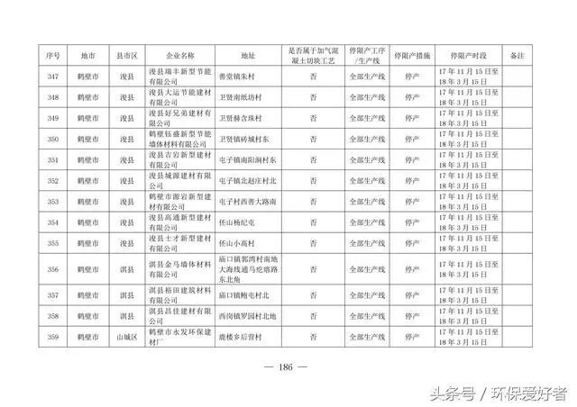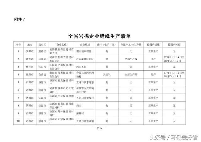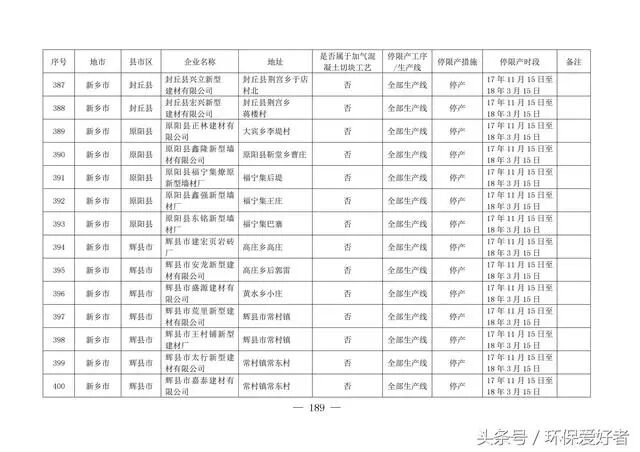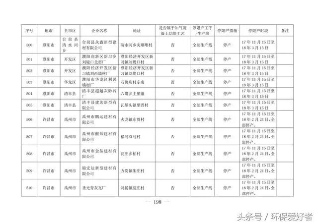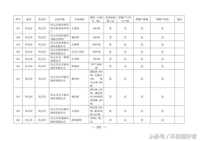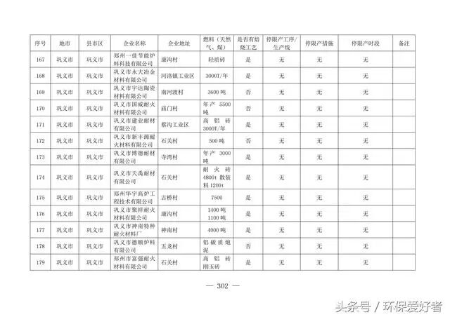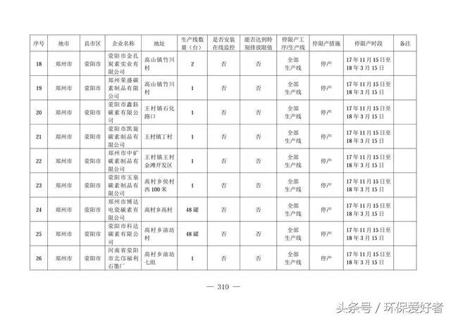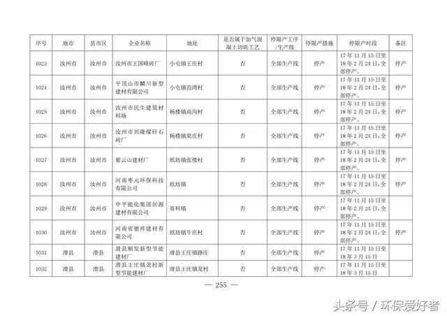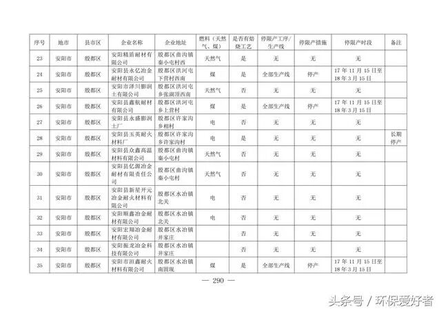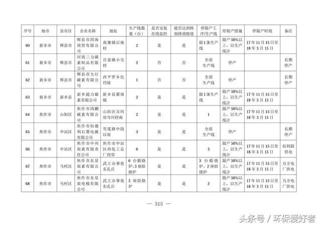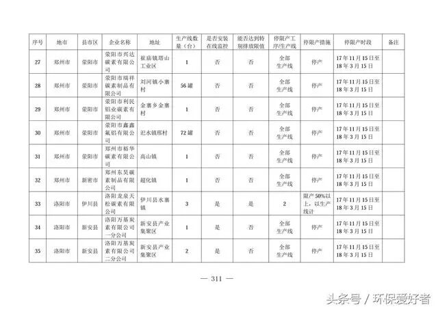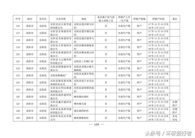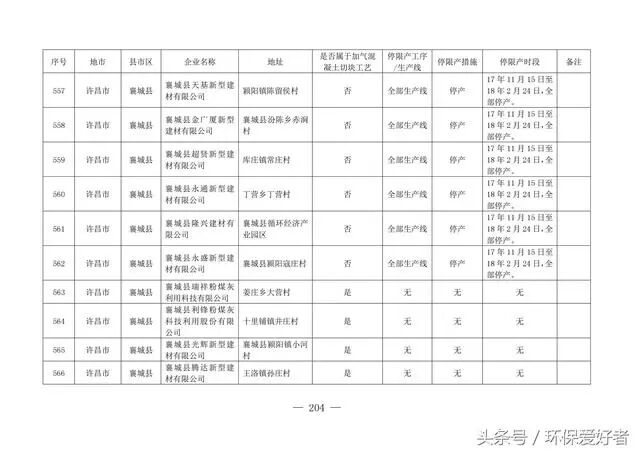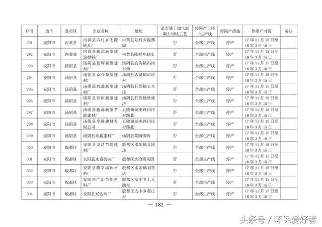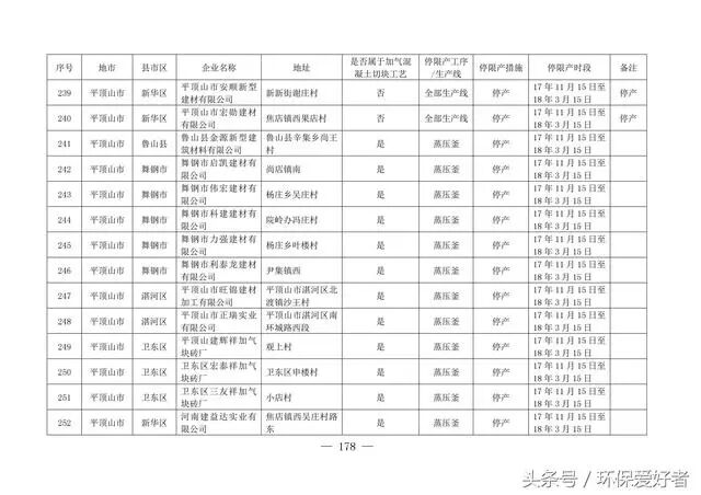 1.郑州市、开封市、安阳市、鹤壁市、新乡市、焦作市、濮阳市、巩义市、兰考县、滑县、长垣县等京津冀大气污染传输通道城市和洛阳市、平顶山市行政区域内的50家水泥、545家砖瓦窑、47家陶瓷、2家岩棉、6家石膏板、23家耐材企业,2017年11月15日至2018年3月15日,全部停产。