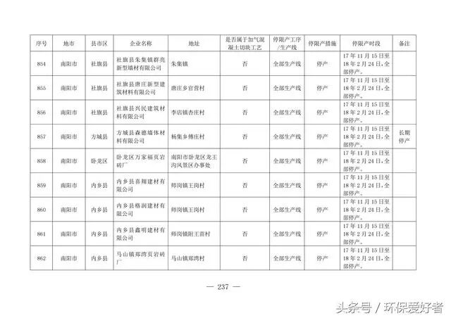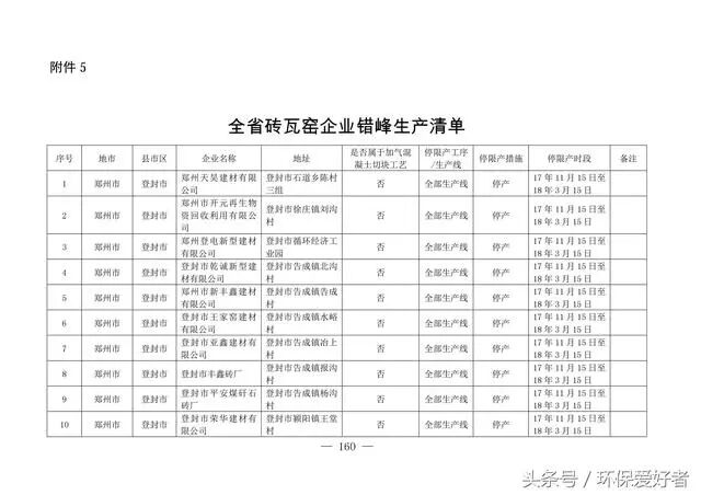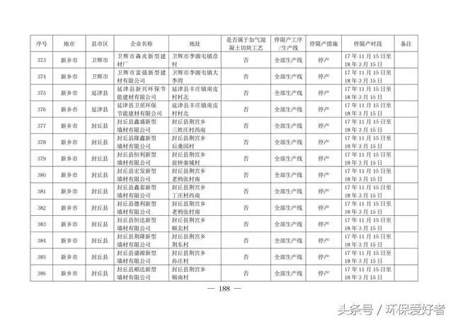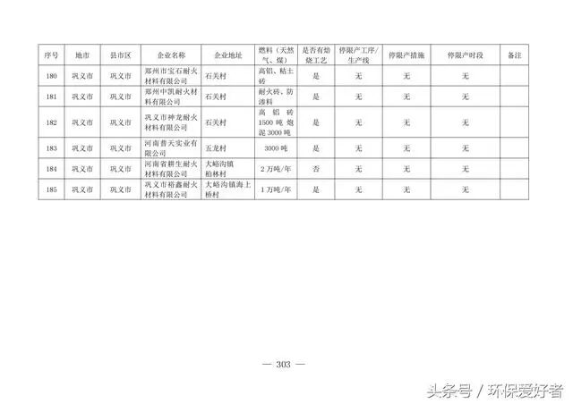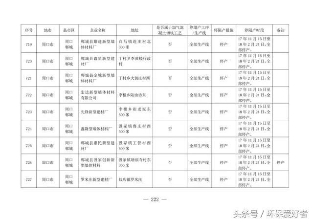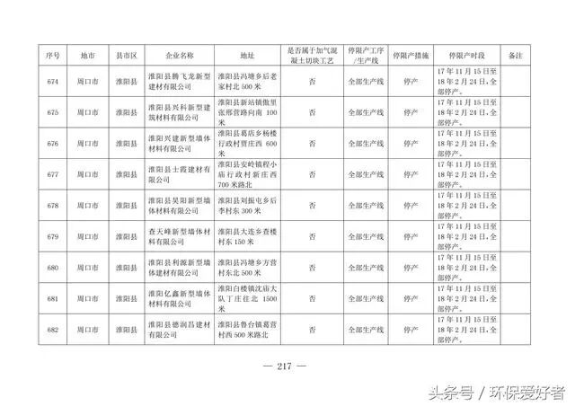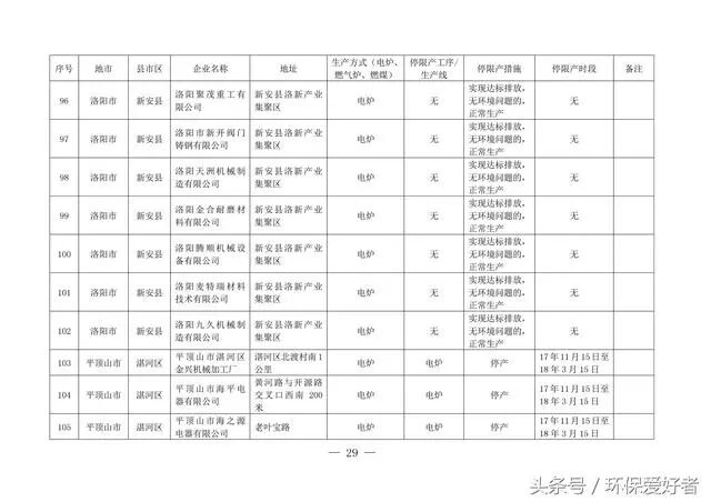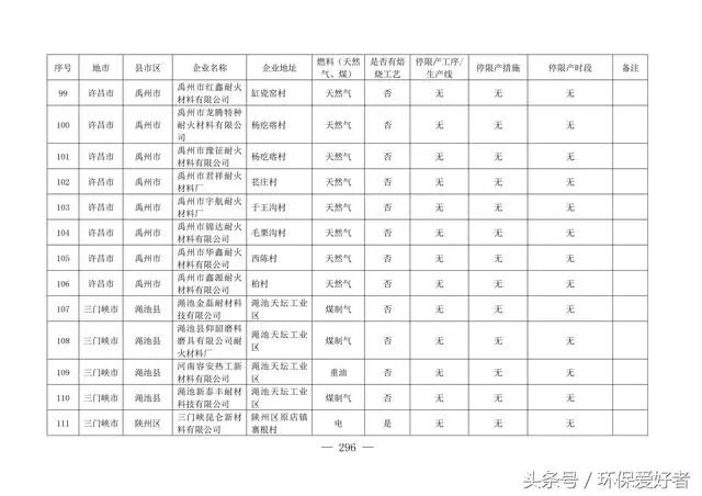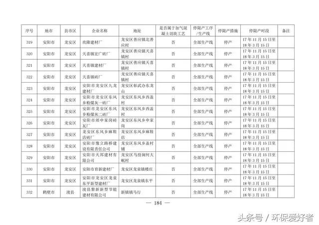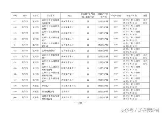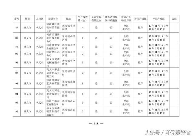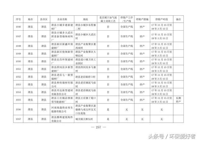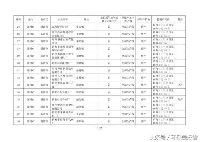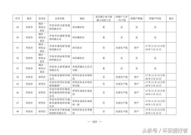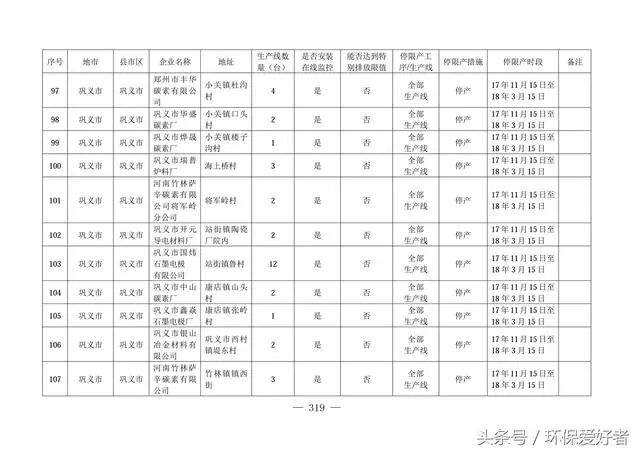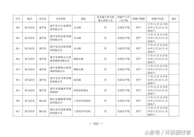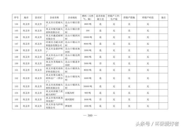 1.郑州市、开封市、安阳市、鹤壁市、新乡市、焦作市、濮阳市、巩义市、兰考县、滑县、长垣县等京津冀大气污染传输通道城市和洛阳市、平顶山市行政区域内的50家水泥、545家砖瓦窑、47家陶瓷、2家岩棉、6家石膏板、23家耐材企业,2017年11月15日至2018年3月15日,全部停产。