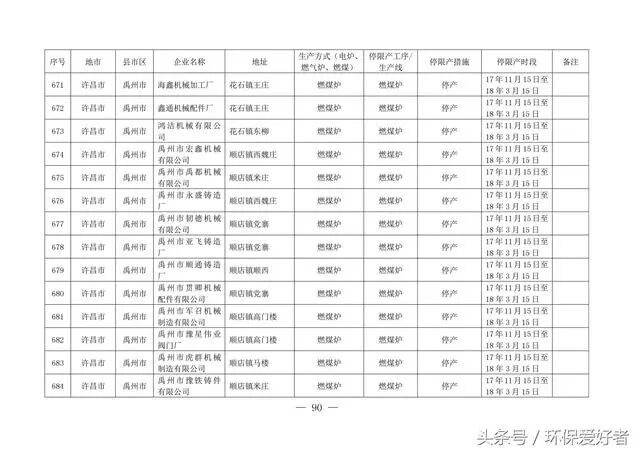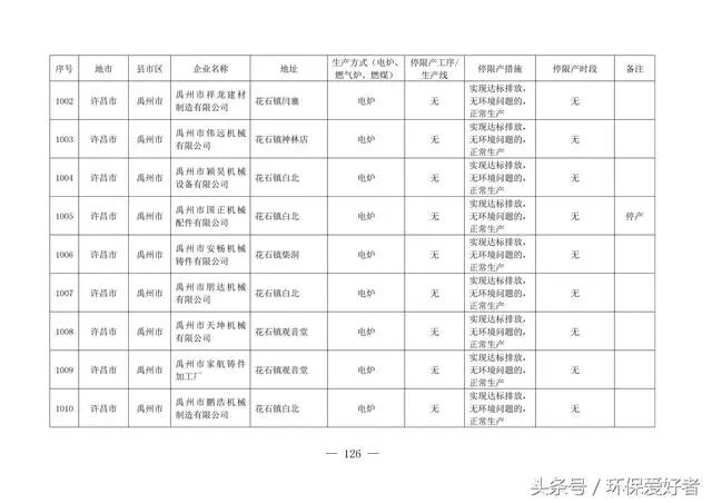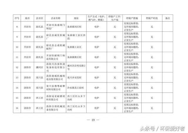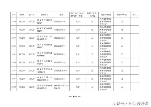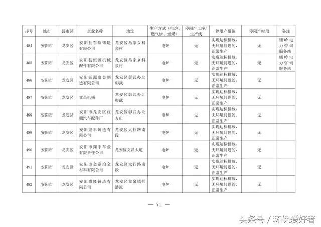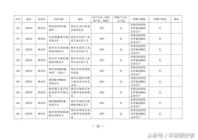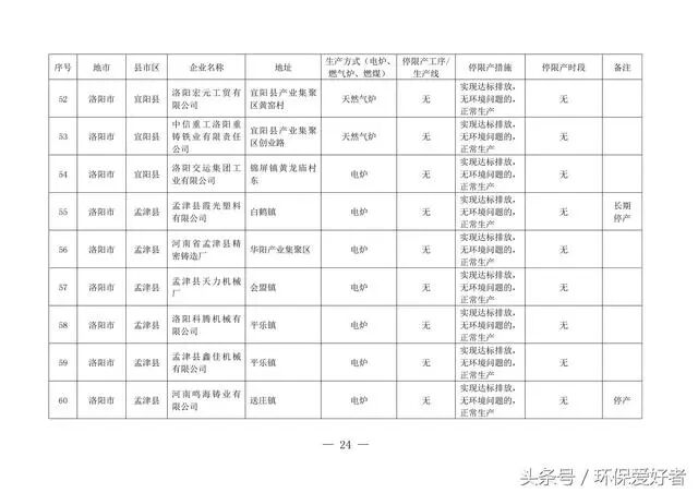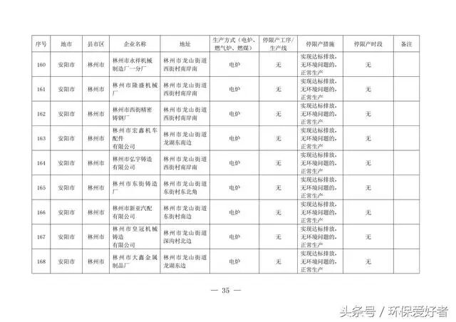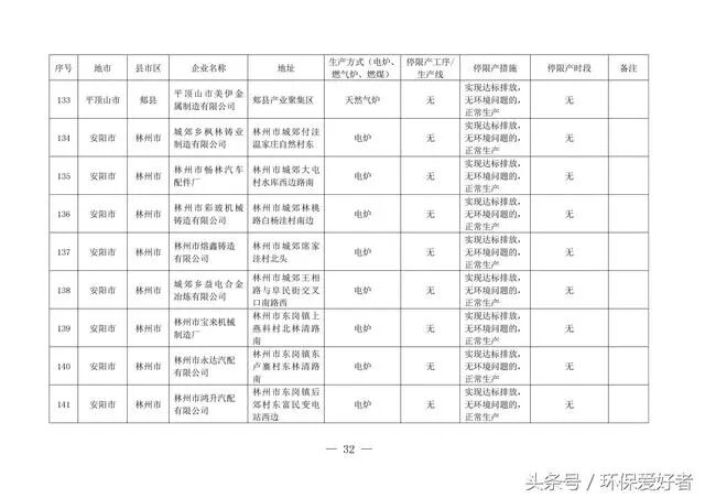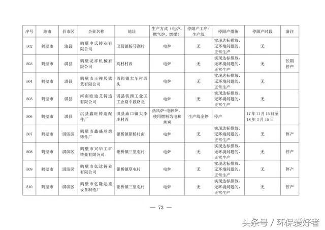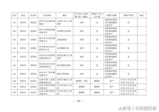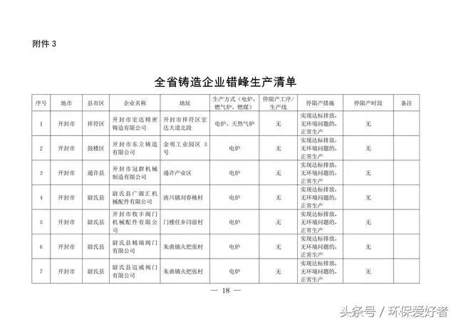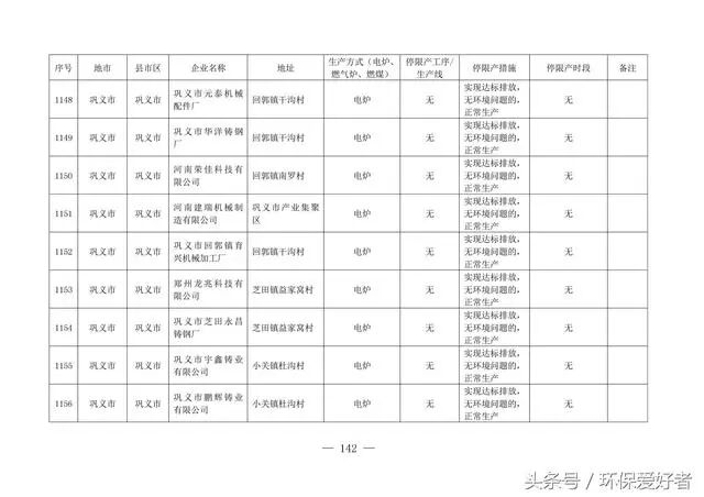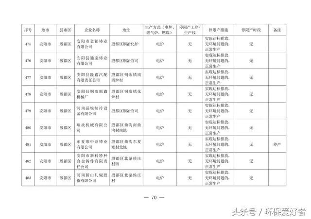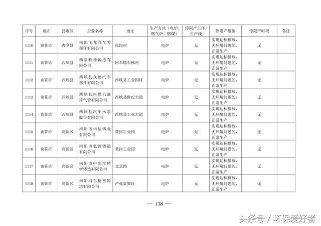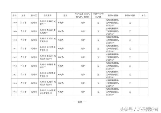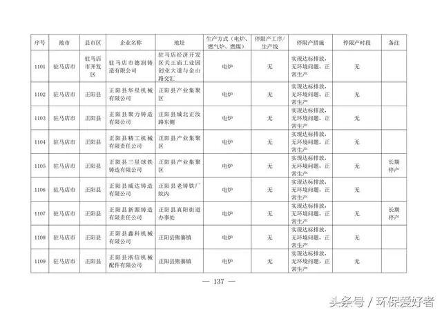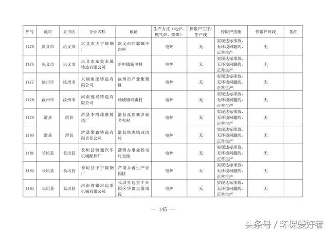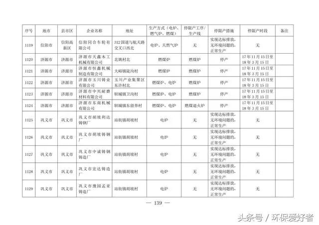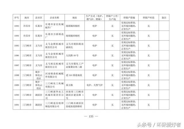 2.2017年10月31日前,各省辖市、省直管县(市)要组织对1089家使用电炉、天然气炉的铸造企业,逐家排查验收,对能够稳定达到《工业炉窑大气污染物排放标准(DB41/1066-2015)》要求的,允许其正常生产;对不能稳定达标排放或被各级督查发现存在环境污染问题的,一律纳入采暖季停产范围。验收核查情况于11月5日前报省环境攻坚办备案。具体停限产情况见附件。