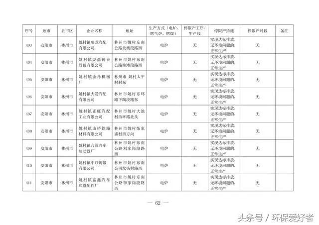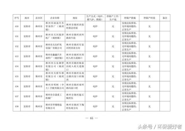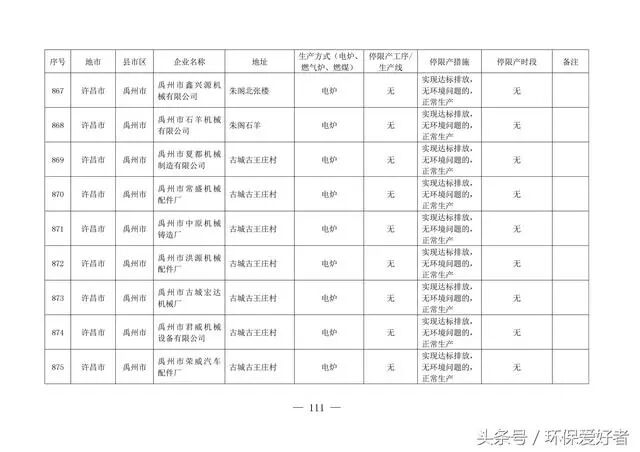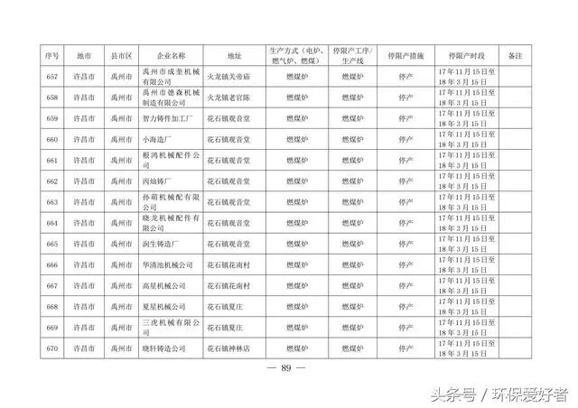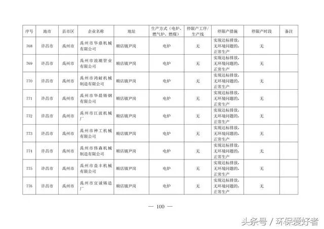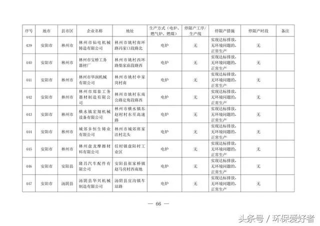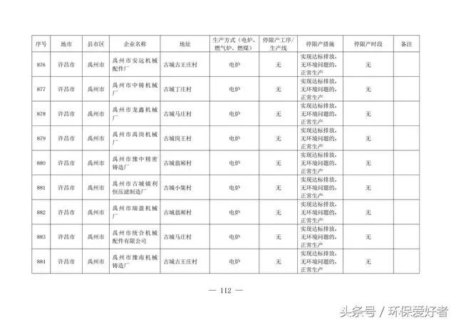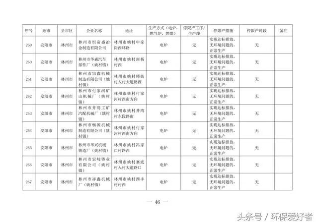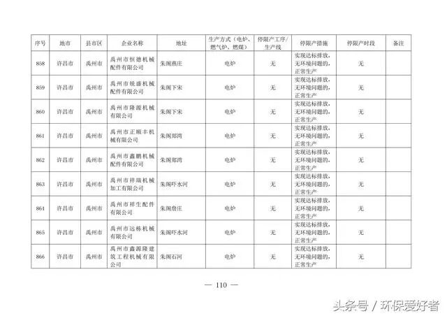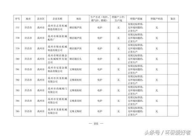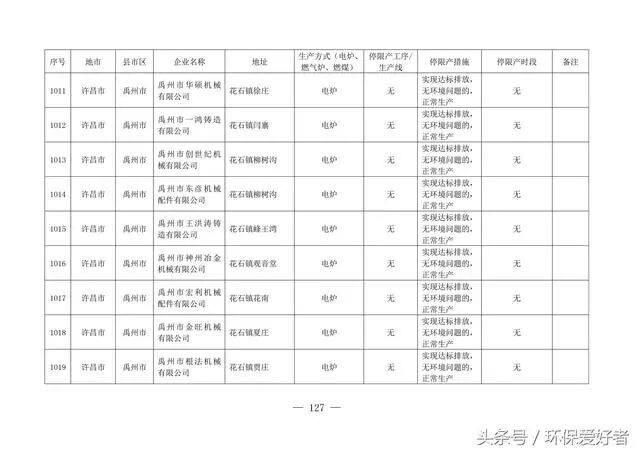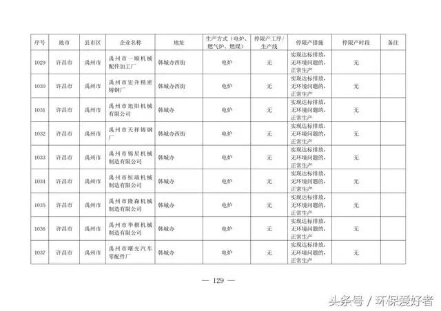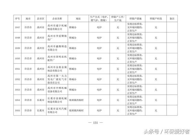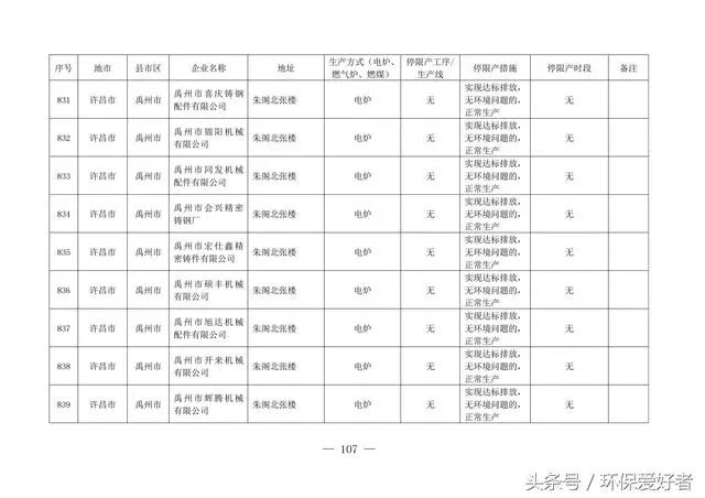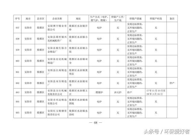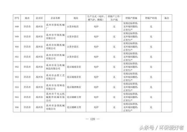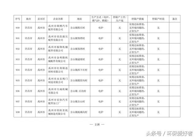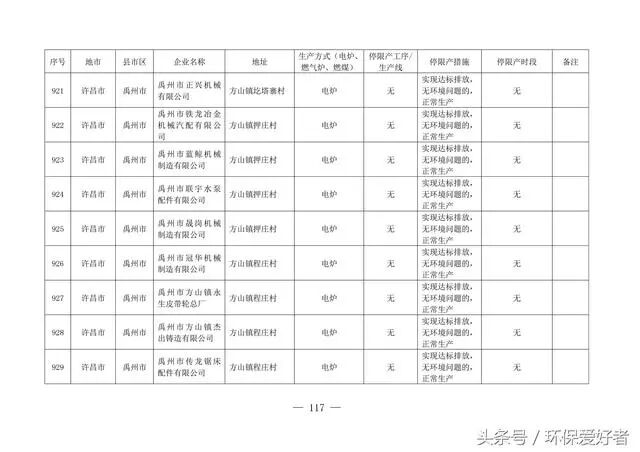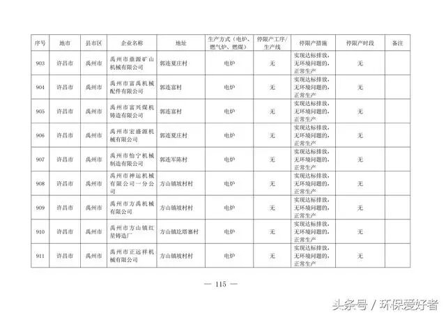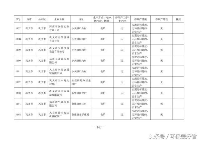 2.2017年10月31日前,各省辖市、省直管县(市)要组织对1089家使用电炉、天然气炉的铸造企业,逐家排查验收,对能够稳定达到《工业炉窑大气污染物排放标准(DB41/1066-2015)》要求的,允许其正常生产;对不能稳定达标排放或被各级督查发现存在环境污染问题的,一律纳入采暖季停产范围。验收核查情况于11月5日前报省环境攻坚办备案。具体停限产情况见附件。