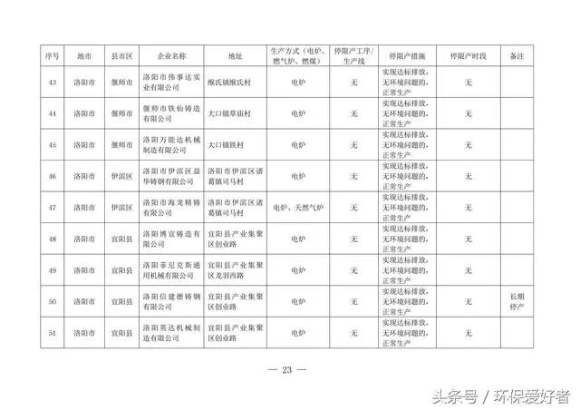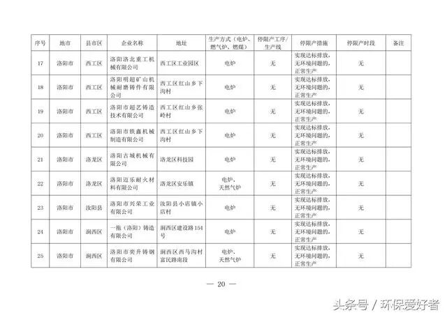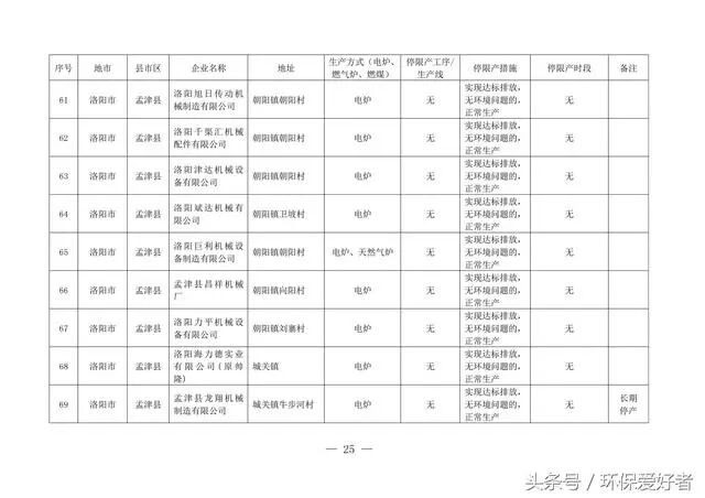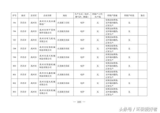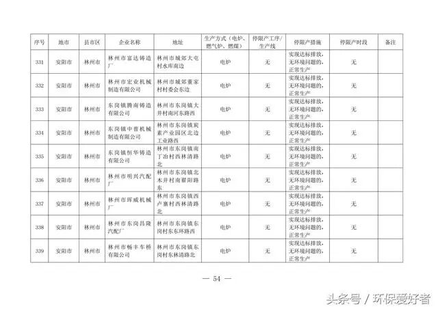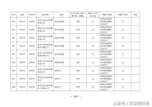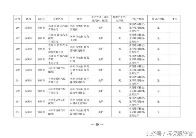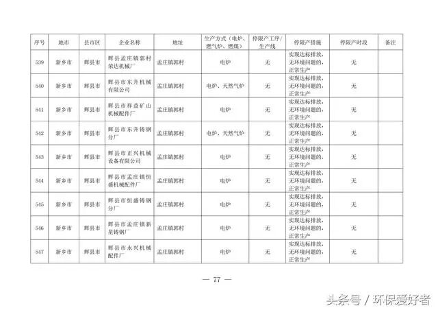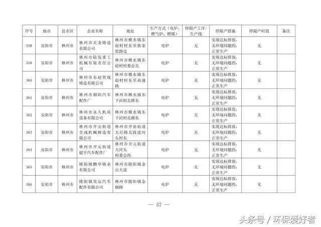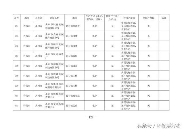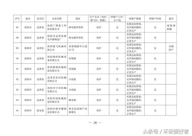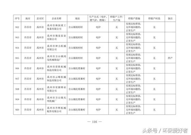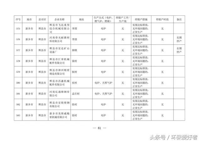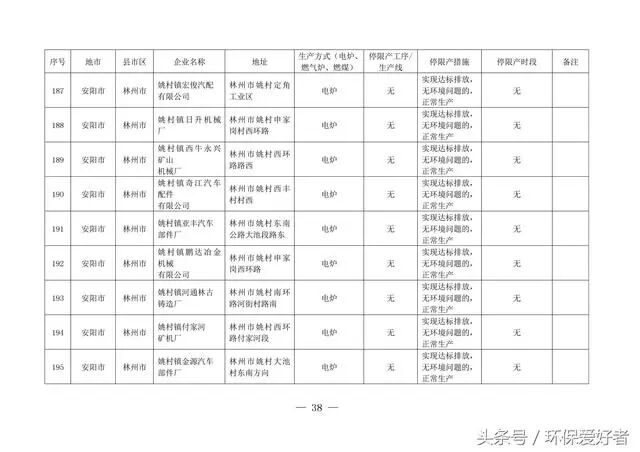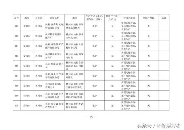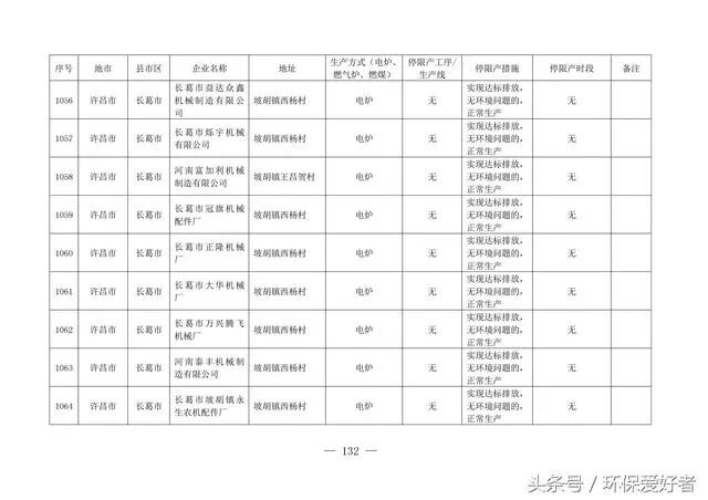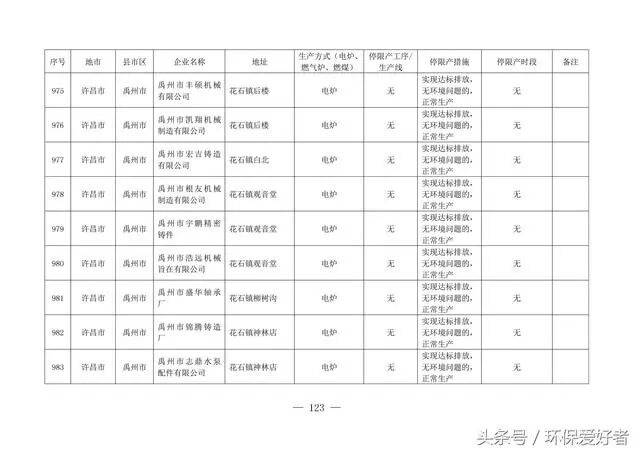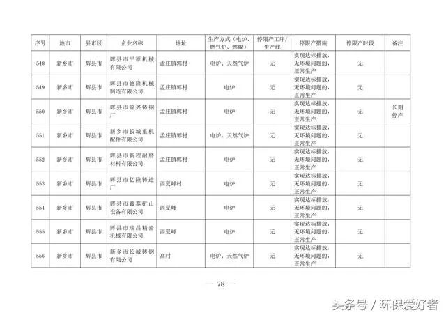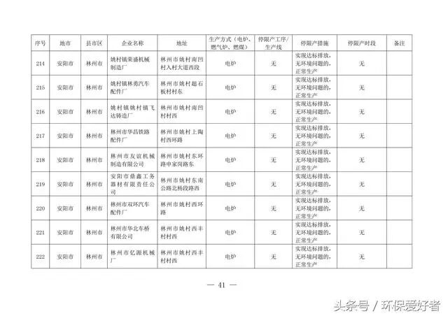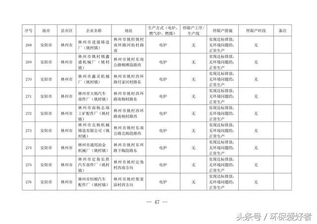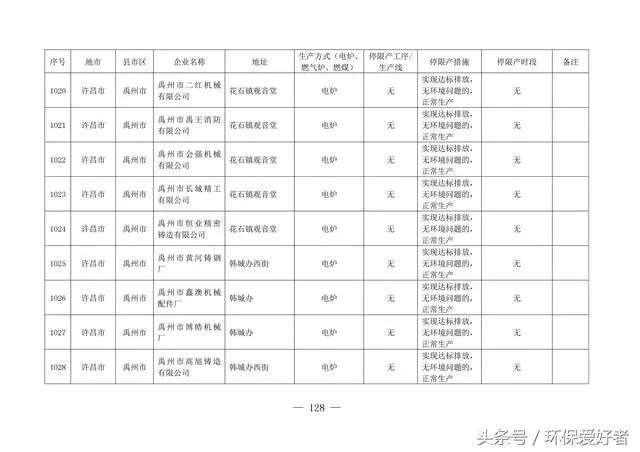 2.2017年10月31日前,各省辖市、省直管县(市)要组织对1089家使用电炉、天然气炉的铸造企业,逐家排查验收,对能够稳定达到《工业炉窑大气污染物排放标准(DB41/1066-2015)》要求的,允许其正常生产;对不能稳定达标排放或被各级督查发现存在环境污染问题的,一律纳入采暖季停产范围。验收核查情况于11月5日前报省环境攻坚办备案。具体停限产情况见附件。