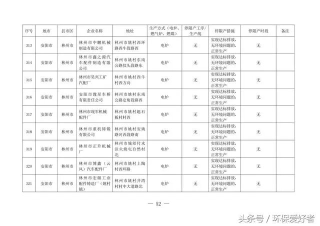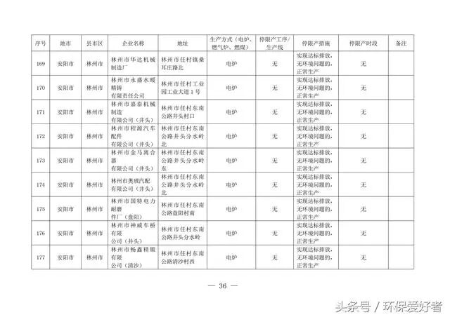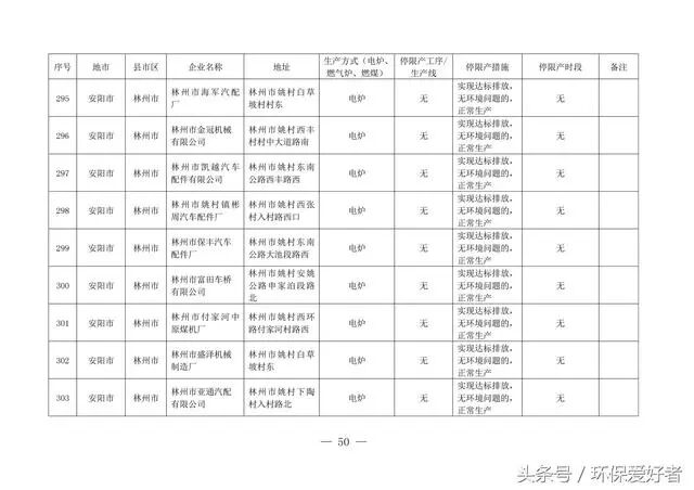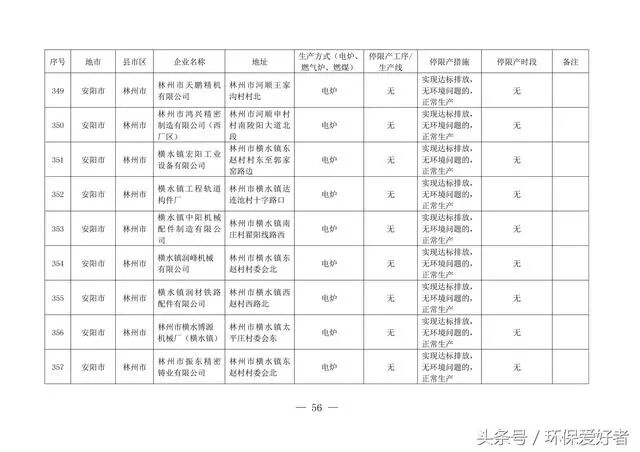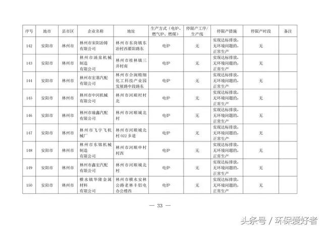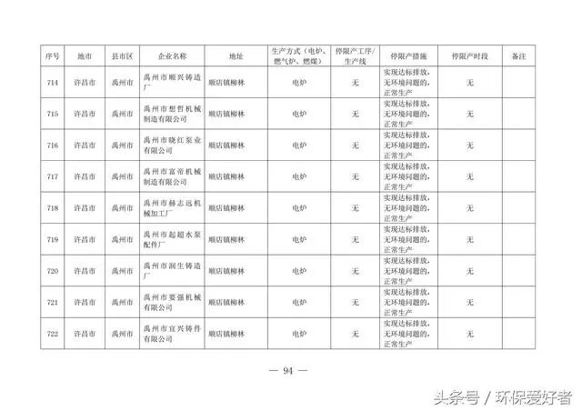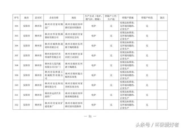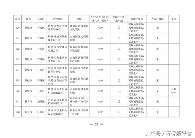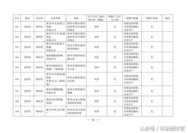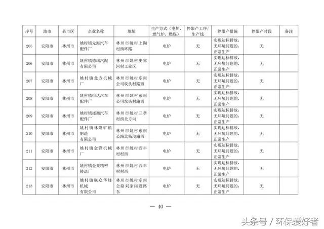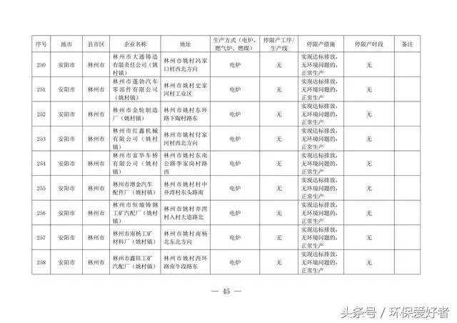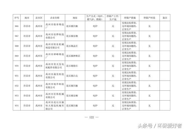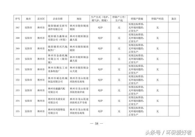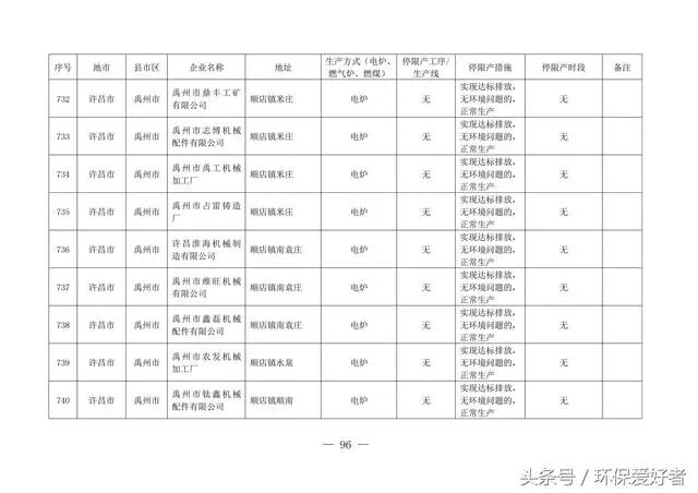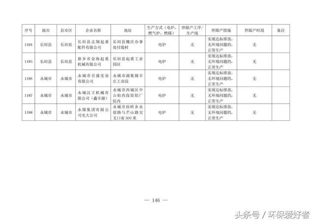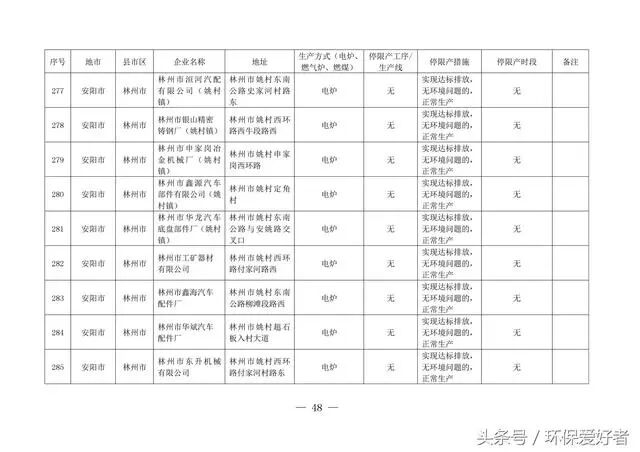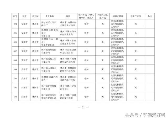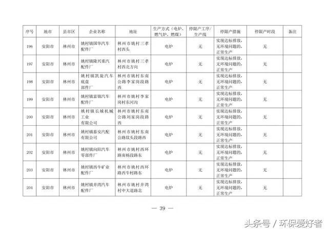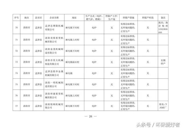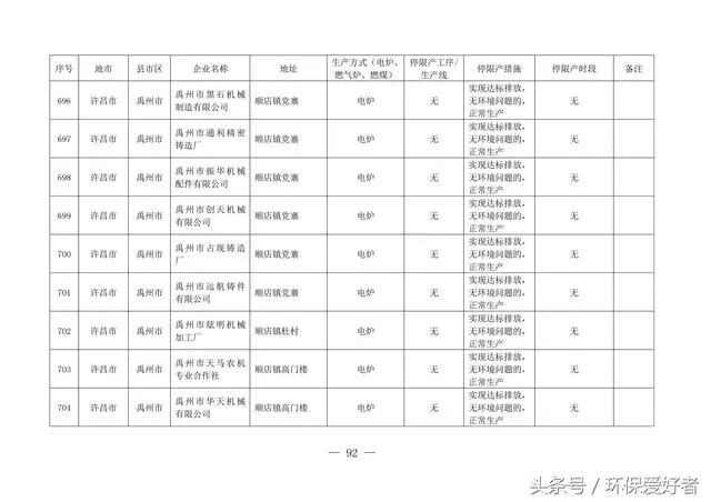 2.2017年10月31日前,各省辖市、省直管县(市)要组织对1089家使用电炉、天然气炉的铸造企业,逐家排查验收,对能够稳定达到《工业炉窑大气污染物排放标准(DB41/1066-2015)》要求的,允许其正常生产;对不能稳定达标排放或被各级督查发现存在环境污染问题的,一律纳入采暖季停产范围。验收核查情况于11月5日前报省环境攻坚办备案。具体停限产情况见附件。