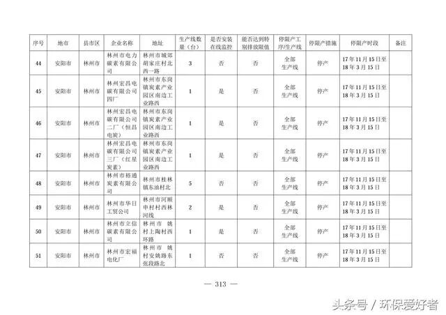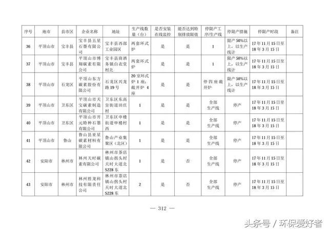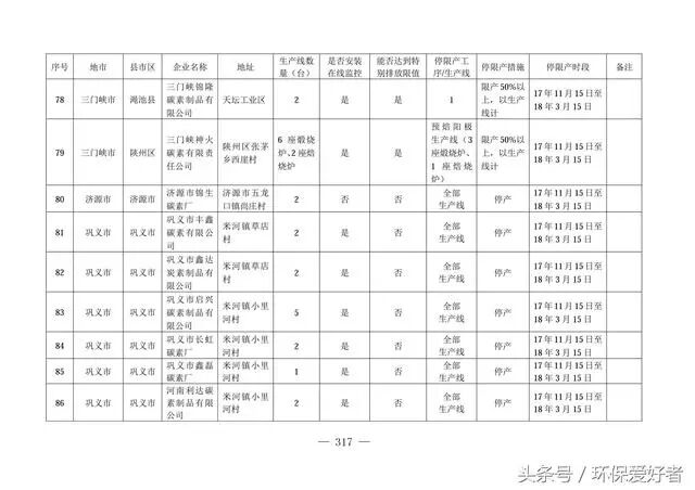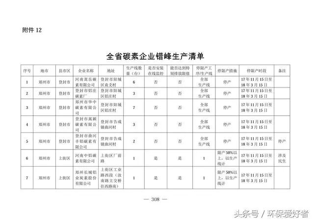 3. 2017年10月31日前,各省辖市、省直管县(市)要组织对111家炭素企业逐家排查验收,对能够稳定达到《铝工业污染物排放标准(GB25465-2010)》修改单特别排放限值要求的炭素企业,限产50%以上,以生产线计,采取现场督查抽查核实;对未安装大气污染物在线监测设施、或不能稳定达到特别排放限值要求、或被各级督查发现环境污染问题的炭素企业,一律纳入采暖季停产范围。验收核查情况于11月5日前报省环境攻坚办备案。