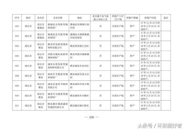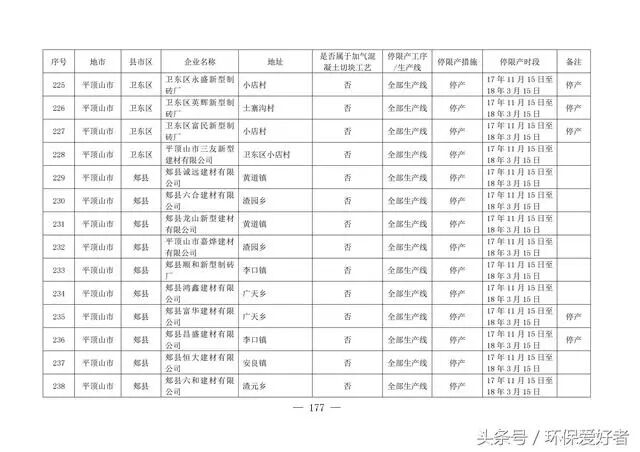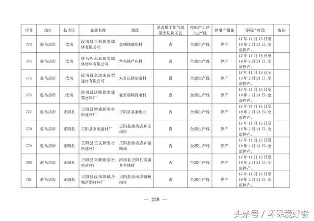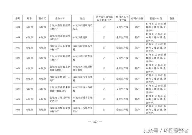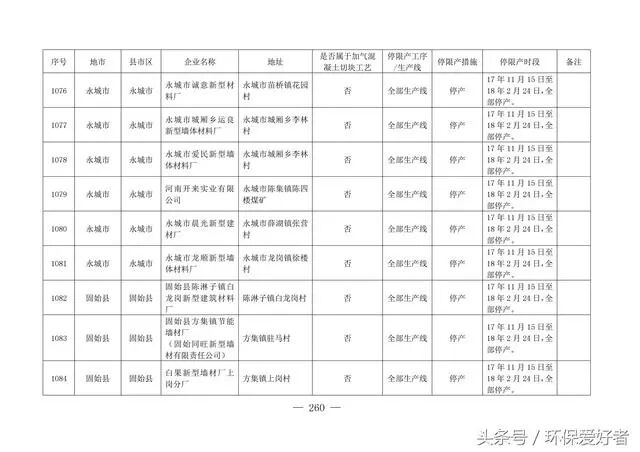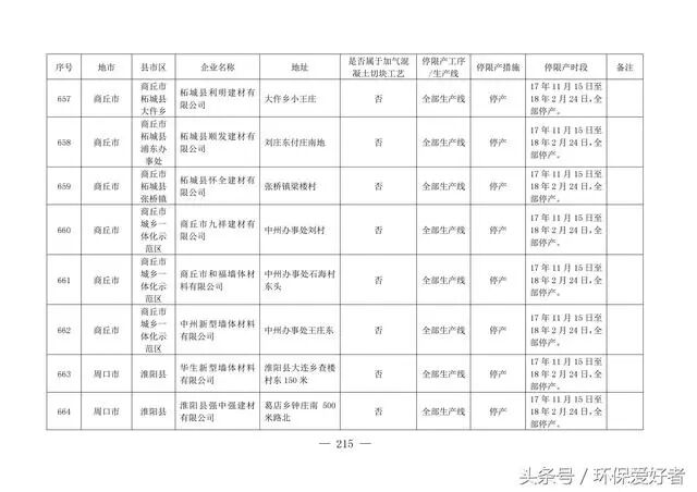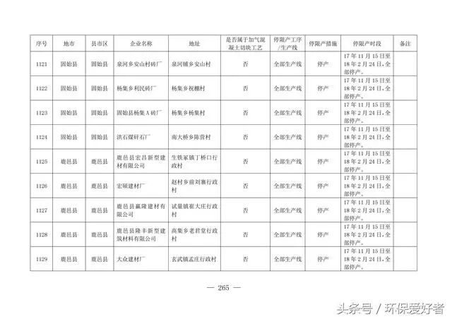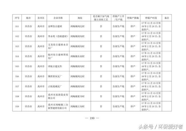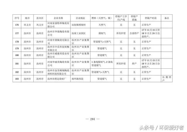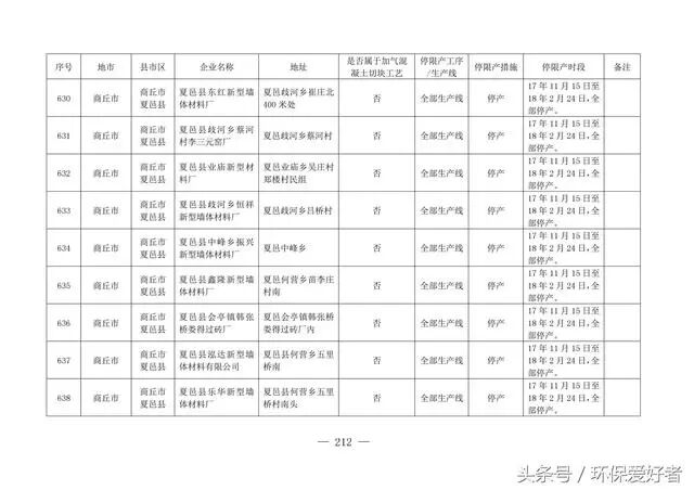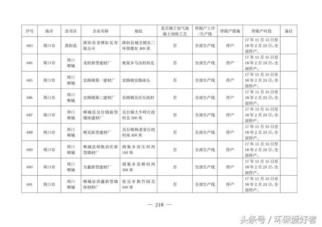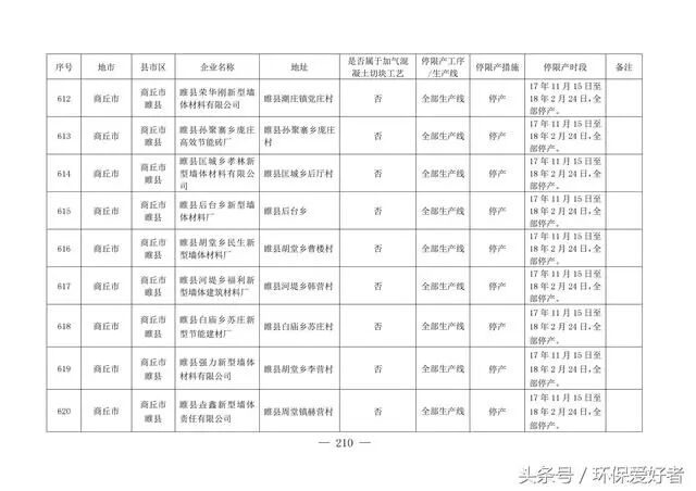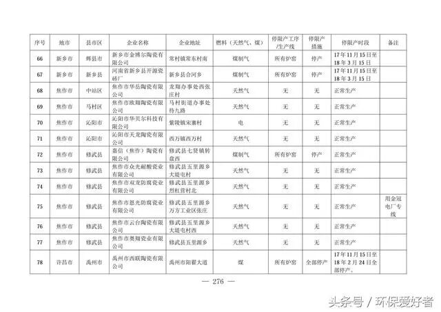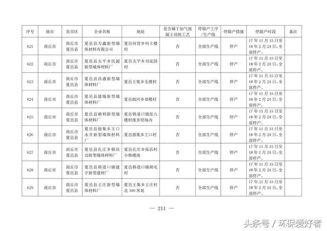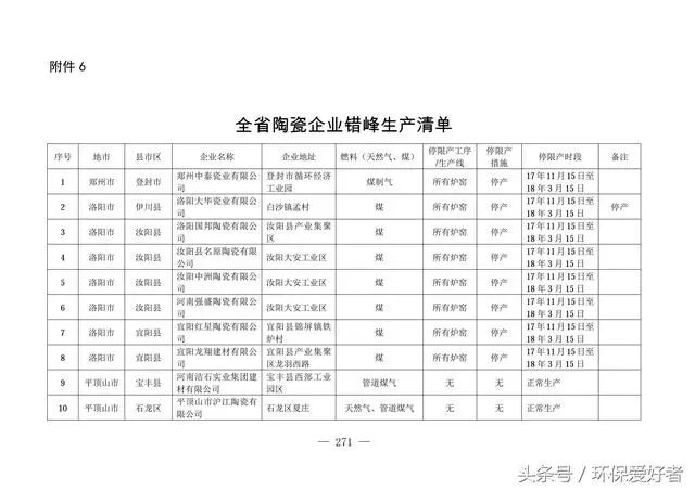 3.其余省辖市、省直管县(市)行政区域内的609家砖瓦窑、14家陶瓷、1家岩棉、2家石膏板、5家耐材企业,2017年11月15日至2018年2月24日,全部停产;2018年2月25日起,恢复生产。