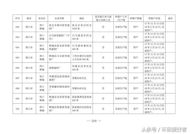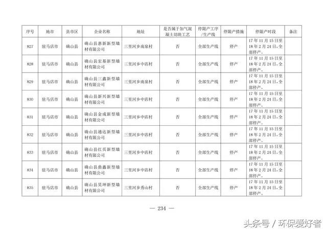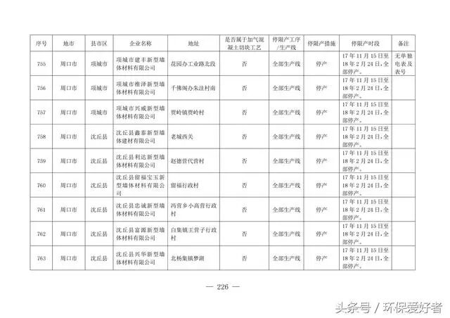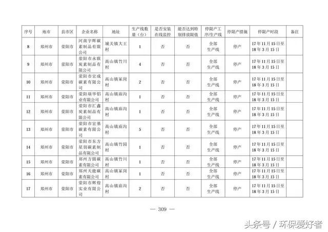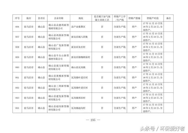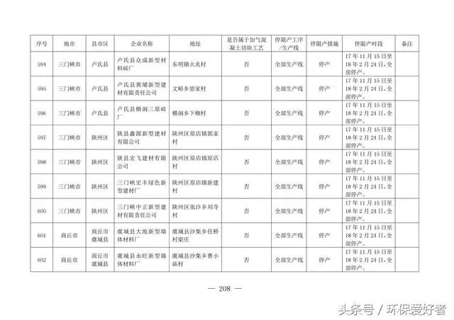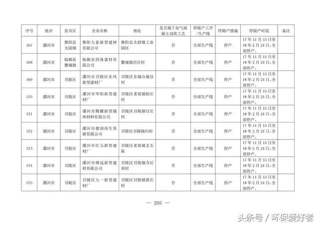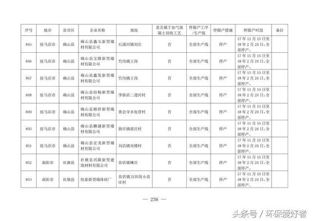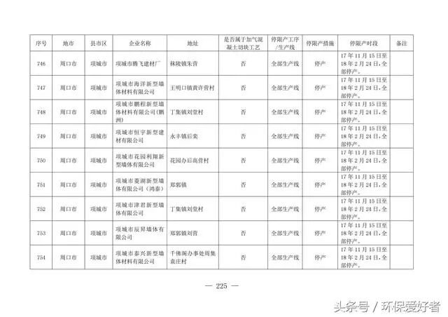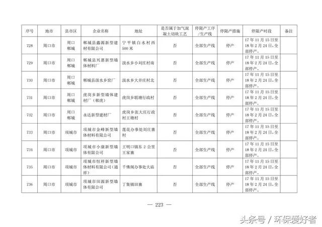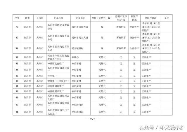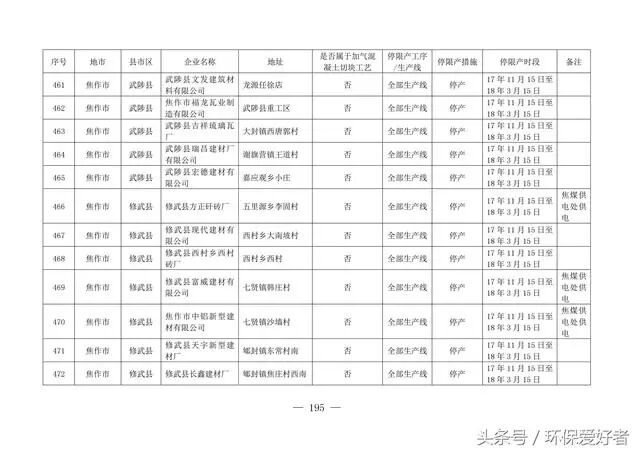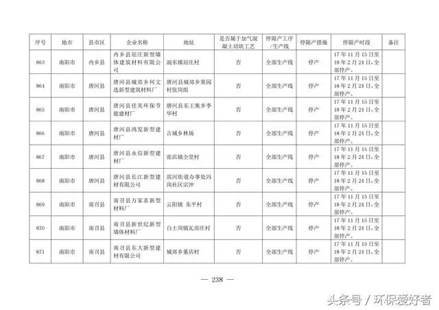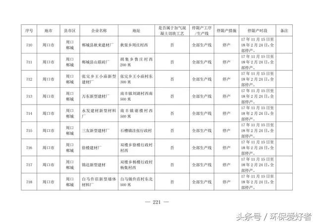 3.其余省辖市、省直管县(市)行政区域内的609家砖瓦窑、14家陶瓷、1家岩棉、2家石膏板、5家耐材企业,2017年11月15日至2018年2月24日,全部停产;2018年2月25日起,恢复生产。