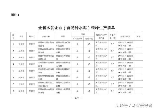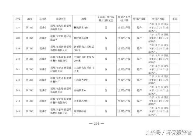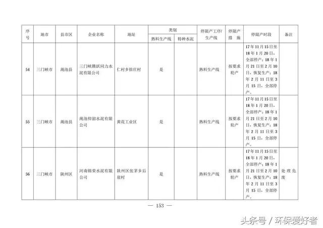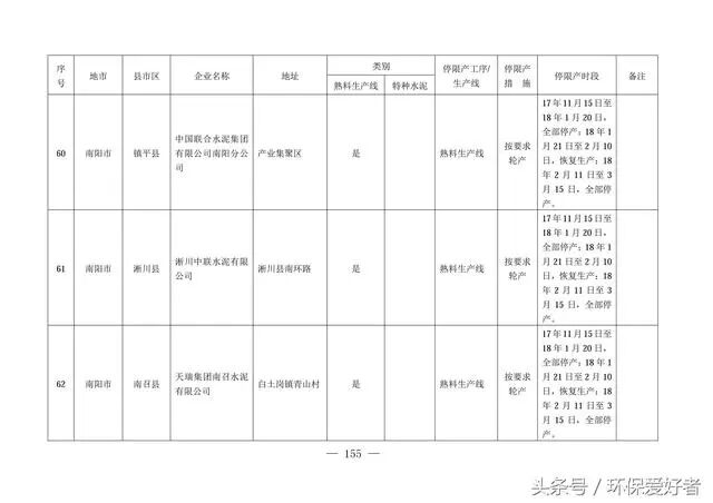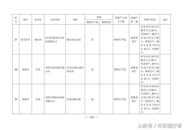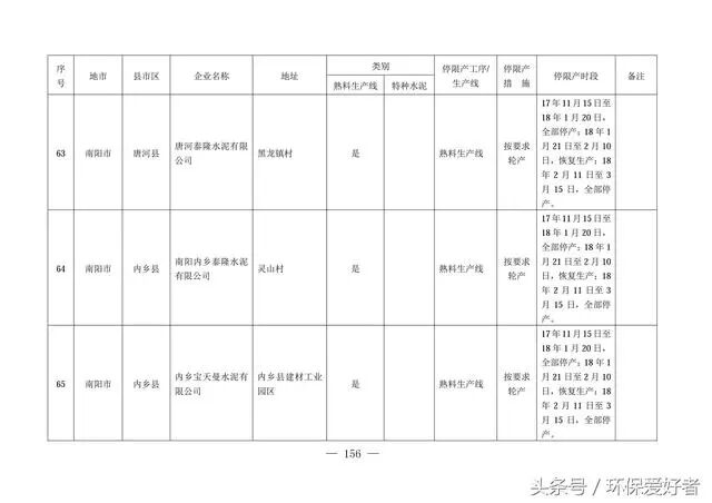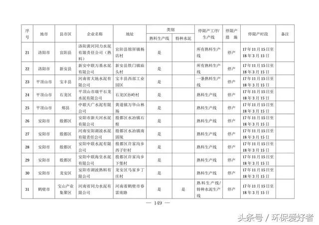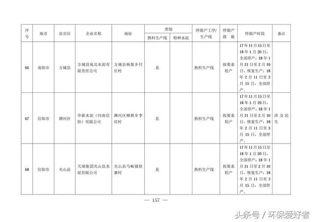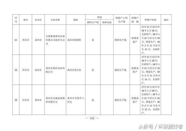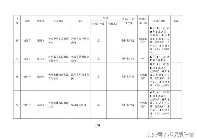 2.其余省辖市、省直管县(市)行政区域内的24家水泥企业,2017年11月15日至2018年1月20日,全部停产;2018年1月21日至2月10日,恢复生产;2018年2月11日至3月15日,全部停产。
