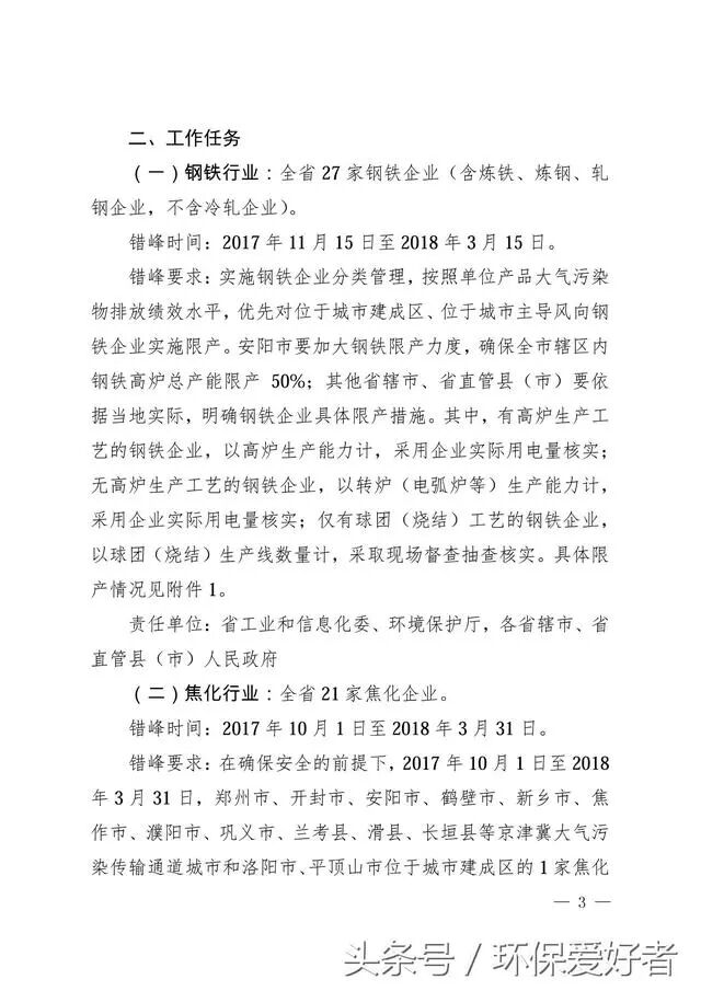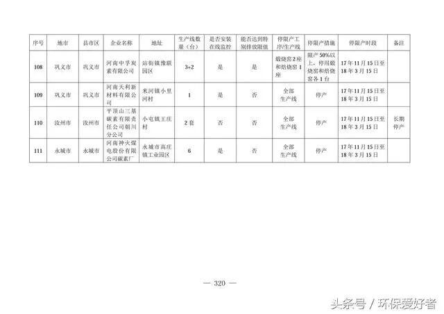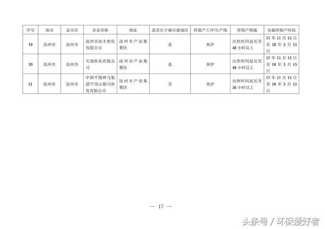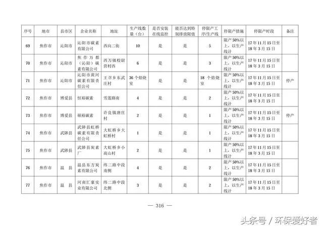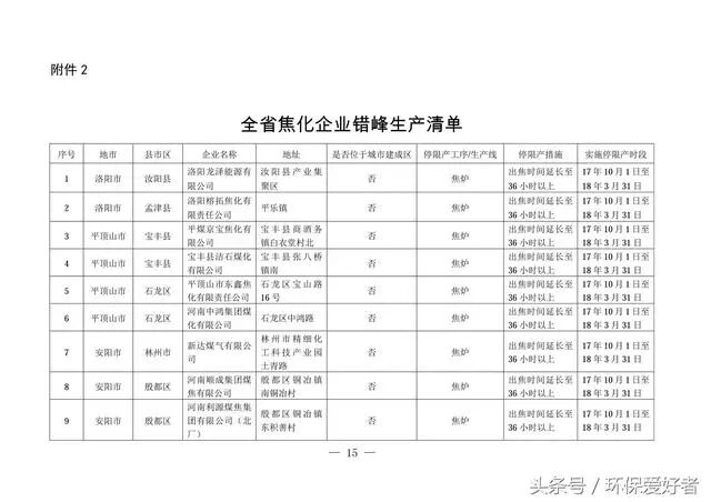 错峰要求:在确保安全的前提下,2017年10月1日至2018年3月31日,郑州市、开封市、安阳市、鹤壁市、新乡市、焦作市、濮阳市、巩义市、兰考县、滑县、长垣县等京津冀大气污染传输通道城市和洛阳市、平顶山市位于城市建成区的1家焦化企业出焦时间延长至48小时以上,其余12家焦化企业出焦时间延长至36小时以上,采用企业实际出焦量核实;2017年11月15日至2018年3月15日,其余省辖市、省直管县(市)位于城市建成区的4家焦化企业出焦时间延长至48小时以上,其余4家焦化企业出焦时间延长至36小时以上,采用企业实际出焦量核实。具体限产情况见附件。