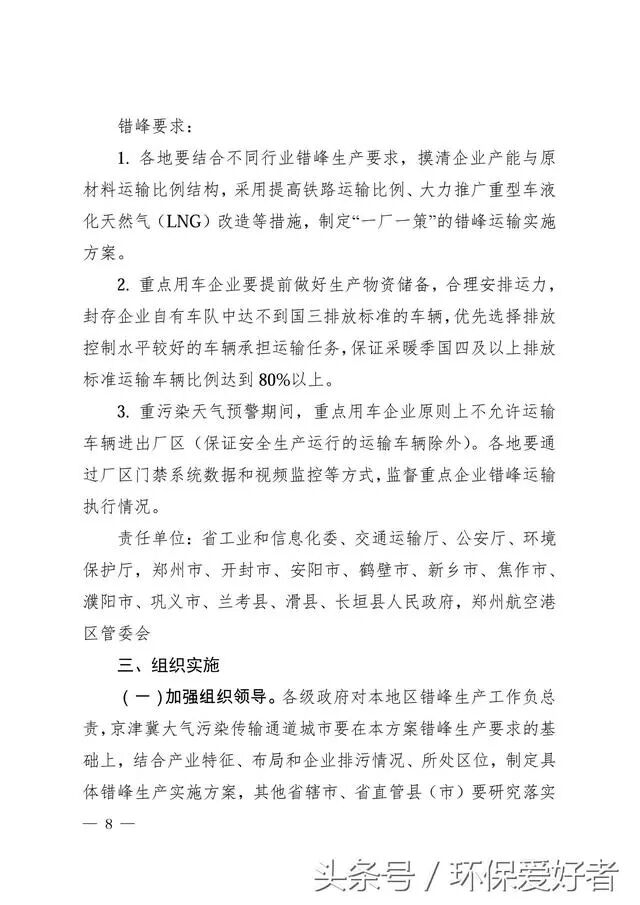 1.各地要结合不同行业错峰生产要求,摸清企业产能与原材料运输比例结构,采用提高铁路运输比例、大力推广重型车液化天然气(LNG)改造等措施,制定“一厂一策”的错峰运输实施方案。