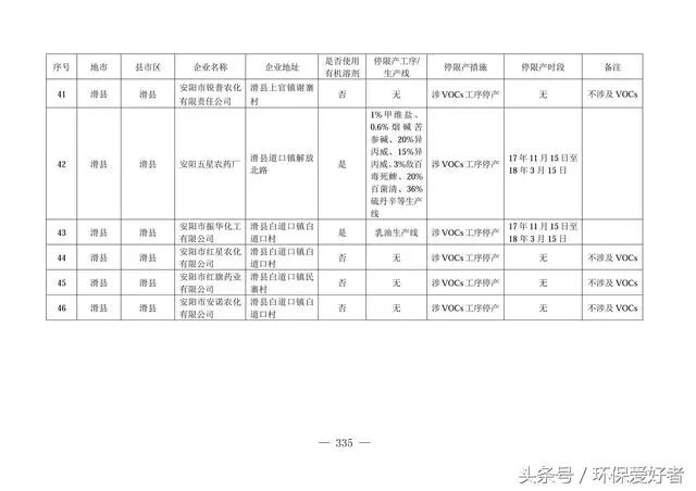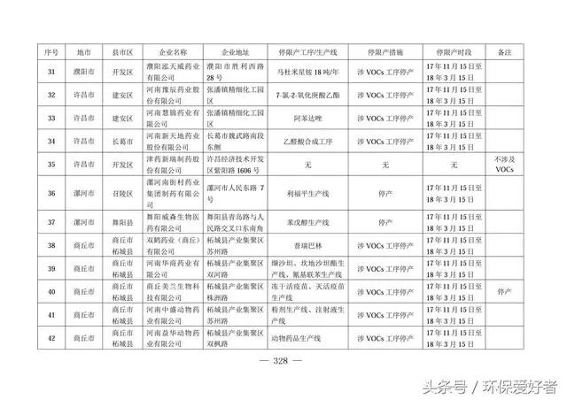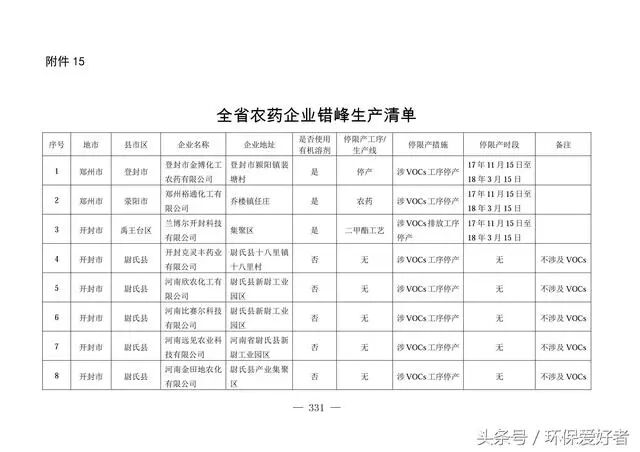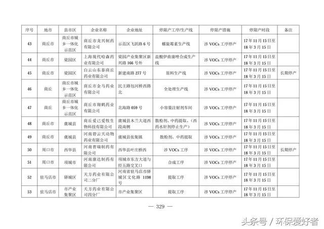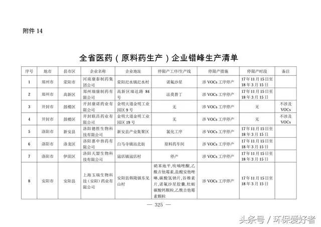错峰要求:48家原料药生产企业和35家生产过程中使用有机溶剂的农药企业的涉VOCs排放工序,原则上全部实施停产。由于民生等需求存在特殊情况确需生产的,于2017年9月30日前报省人民政府批准。具体停限产情况见附件。