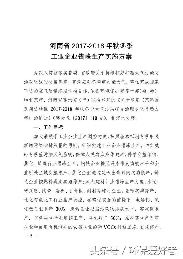 河南省2017-2018年秋冬季工业企业错峰生产实施方案