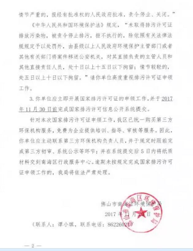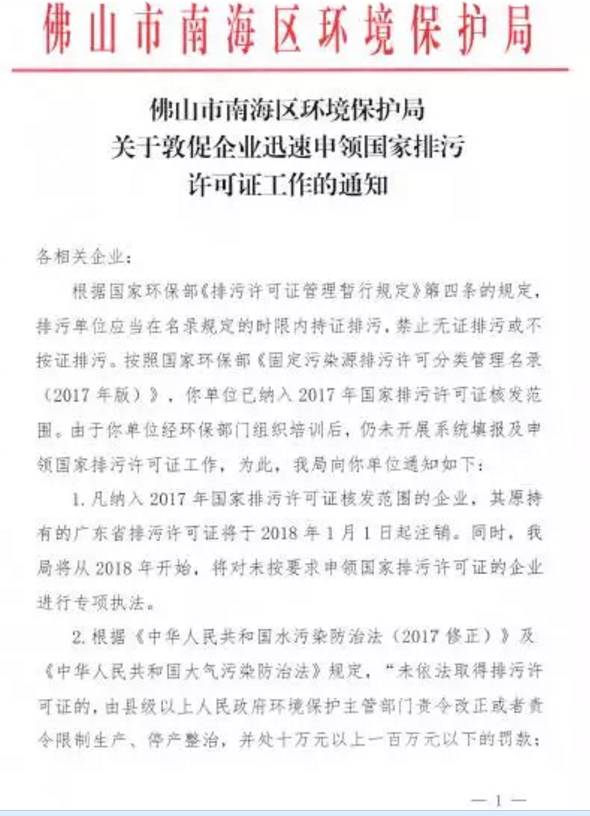 环保局提醒企业,2018年开始,环保部门将对未按要求申领国家排污许可证的企业进行专项执法。根据有关法律规定,未依法取得排污许可证的,将面临责令改正或者责令限制生产、停产整治,并处十万元以上一百万元以下的罚款。(来源:南海环保)