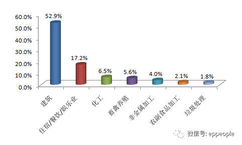 (二)行业类型。从全国举报情况来看,公众反映最集中的行业是建筑业,占52.9%,其次是住宿/餐饮/娱乐业和化工业,分别占17.2%和6.5%。8-10月举报次数较多的企业有江西省南昌市麦园垃圾填埋场、宁夏回族自治区银川市启元药业、广东省广州市云埔工业区、深圳市红花岭垃圾填埋场、下坪垃圾填埋场等。