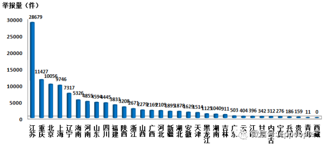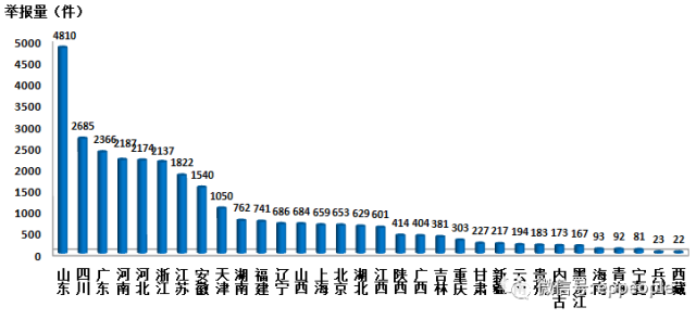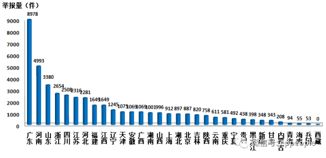 | 排名 | 省份 | 举报量/件 | 排名 | 省份 | 举报量/件 | |
