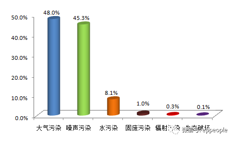 (一)污染类型。2017年8-10月全国各类举报中,涉及大气污染的举报最多,占48%,其次为涉及噪声、水、固废的污染举报,分别占45.3%、8.1%、1%,举报量相对较少的为辐射污染和生态破坏,分别占0.3%和0.1%。