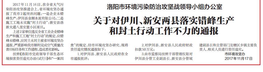 2017年11月16日,在全省大气污染防治攻坚推进会上,省环境攻坚办通报了洛阳市2起突出问题:一是,企业未错峰生产:伊川县金顺水泥有限公司;二是,施工工地未实施“封土行动”:新安县洛新大道八里安置小区项目。