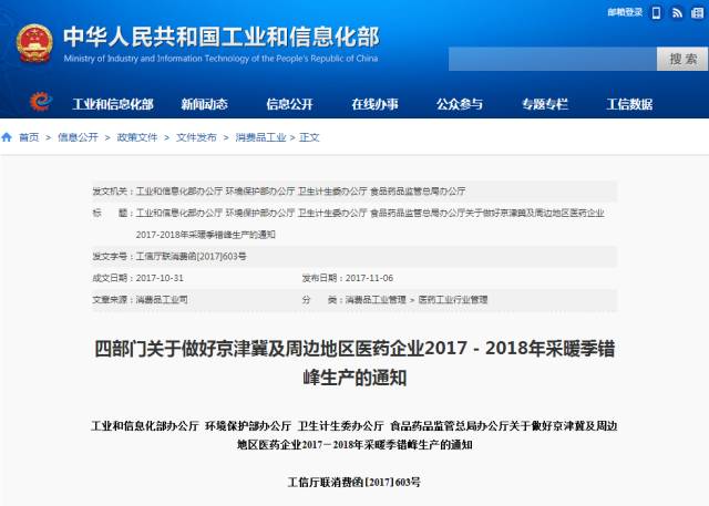 四部委通知:11月15日起涉VOCs工序的原料药企,原则上停产5个月(采暖季,京津冀及"2+26"城市)