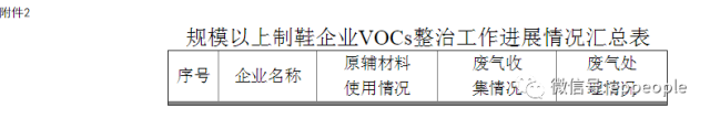 各县区环保局要督促辖区内企业开展VOCs整治工作,分期全面完成全市规模以上鞋业VOCs整治(详见附件)。