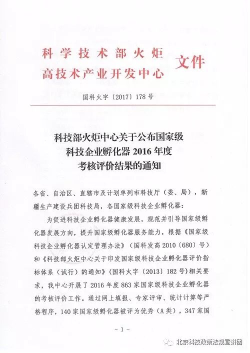 科技部:科技部火炬中心关于公布国家级科技企业孵化器2016年度考核评价结果的通知