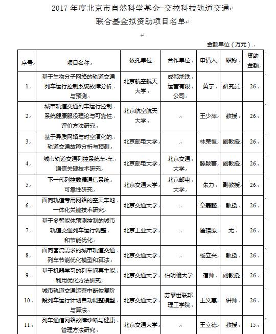 2017年度北京市自然科学基金-交控科技轨道交通联合基金拟资助项目公告