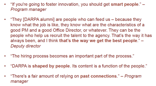 项目经理识别研发团队和顶尖人才主要有三种渠道:一是项目招标遴选,二是从自己掌握的人才资源挖掘,三是科学计量学分析发现。一般而言,每名项目经理都来自大学、院所或企业,对谁有能力攻克某个问题较为熟悉。有时,项目经理就直接找相关科研人员予以资助,而不通过评审程序。有时,项目经理也通过科学计量学指标的数据挖掘分析,若发现有两位科学家同时在攻克同一课题,但采取的技术路线不同,会对他们分别给予资助,从而防止两人今后潜在的重复研究,而两人也省去了反复的经费申请。DARPA选人的最大的特点就是不依赖同行评议、快速决策,对项目和人才的遴选,多由项目经理决定,甚至仅靠项目摘要进行决策。DARPA技术办公室认为,同行评议是为了保证不要资助一个白痴,但同行评议却永远无法保证资助有远见的人。DARPA是唯一的一个不要求外部同行专家评议的资助机构,一些项目经理表示,不采用同行评议可能是DARPA成功的唯一原因。