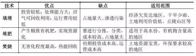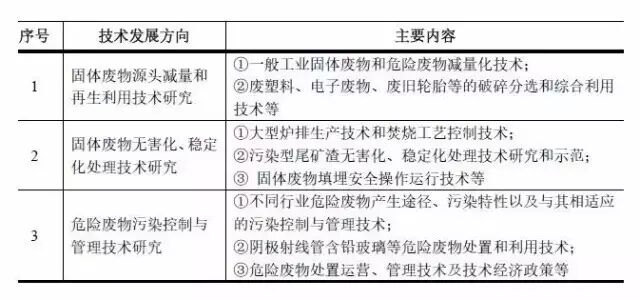 在《国家环境保护“十二五”科技发展规划》中,就提出了“十二五”期间研发一批科技含量高、应用前景广、具有核心竞争力的固体废物污染控制与处理处置关键技术,提升我国固体废物污染控制科技水平。目前主要技术发展方向及其内容如下表所示: