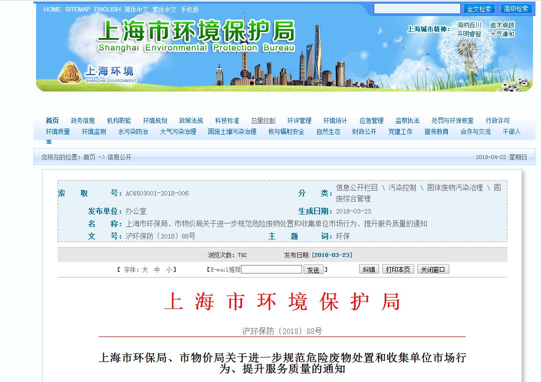 上海市环保局、市物价局关于进一步规范危险废物处置和收集单位市场行为、提升服务质量的通知 |