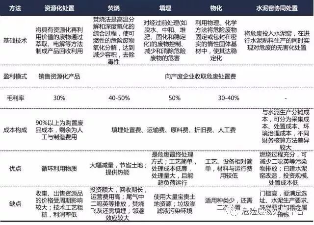 危险废物的焚烧过程较复杂,主流技术还是回转窑,需要综合管理能力。回转窑因焚烧设备在转动,转速可调,操作连续,控制灵活,上料、排渣均可自动化,对固态、液态、半固态废物都能适应,是目前危废处置的主流炉型。一个典型的危废焚烧项目采用回转窑+二次燃烧室高温焚烧方法,焚烧产生的烟气经余热回收后经急冷、活性炭吸附,经布袋除尘器处理后经过酸吸收塔中和,再通过烟囱外排,焚烧残渣及飞灰采用稳定化固化后进入安全填埋场进行填埋处置。,由于危废的物理、化学性质比较复杂,不同批次危险废物的组成、热值、形状和燃烧状态都有较大的变化,同时燃烧后所产生的废气组成和废渣性质也会随之改变。因此对危废焚烧来说,除了焚烧设备技术要求较高外,对综合管理能力、员工素质的要求也较高,实力强、经验丰富的企业占有竞争优势。