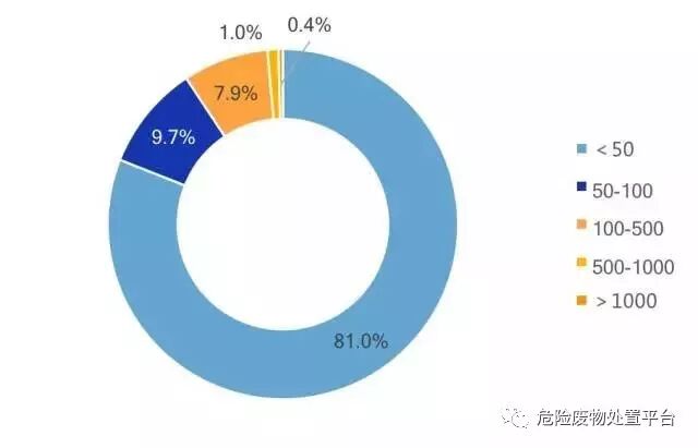 弱:大部分工业危废处理企业技术、资金较弱,处理资质比较单一,这也是危废企业实际处理比例较低的一大原因。据统计,全国1500多家具有危废处理资质的企业的处理类别和能力中,90%的企业经许可处置的危险废物种类都小于10种,而能处理25种以上危废品类的企业仅占1%。从处理量上来看,处理能力低于50吨/日的企业超八成,处理能力达到1000吨/日的企业仅占0.3%。