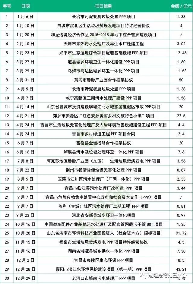 2017年环保界的老大启迪桑德共收获了30个项目,总投资逾334亿元。从最早的1月6日的长冶市污泥餐厨垃圾处置项目到最晚的12月29日老河口市城南污水处理厂项目,再到地下综合管廊、湿地项目、环卫一体化建设、旅游度假区、特色小镇、人居环境改善工程等项目类型,业务区域遍布全国,启迪桑德绝对是有说服力的环境保护综合服务商。