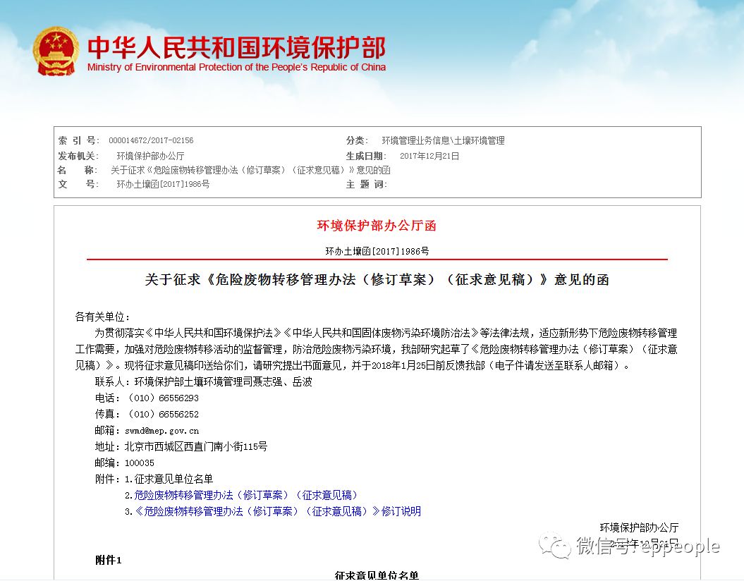 为贯彻落实《中华人民共和国环境保护法》《中华人民共和国固体废物污染环境防治法》等法律法规,适应新形势下危险废物转移管理工作需要,加强对危险废物转移活动的监督管理,防治危险废物污染环境,我部研究起草了《危险废物转移管理办法(修订草案)(征求意见稿)》。现将征求意见稿印送给你们,请研究提出书面意见,并于2018年1月25日前反馈我部(电子件请发送至联系人邮箱)。