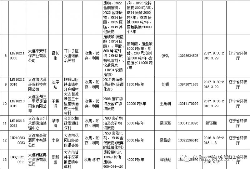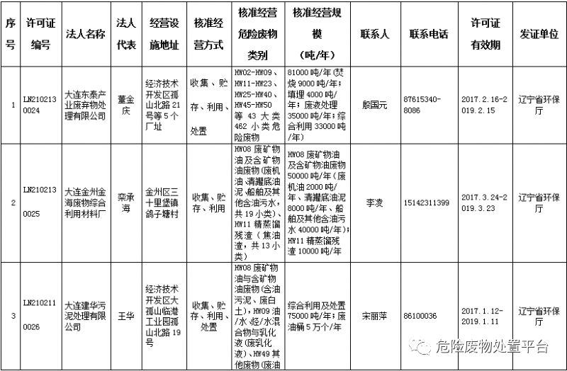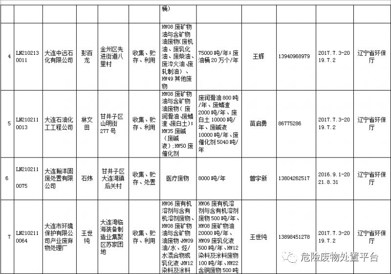 今日,大连市环境保护局公布了大连市危险废物经营许可证单位名单,详情如下: