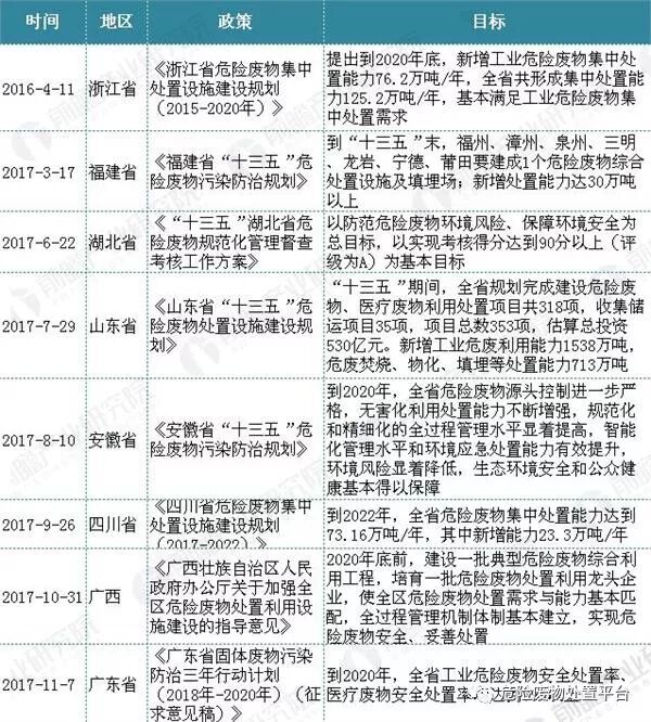 我国危险废物管理工作起步相对较晚,随着2016年版《国家危险废物名录》与两高司法的修订,以及对于危险废物管理制度的改革,政策层面的问题在不断的修补和完善,各地对危险废物监管与防治重视程度也日益提升。2016年以来,浙江省、福建省、湖北省、山东省等多个省份相继出台了危废行业相关规划。