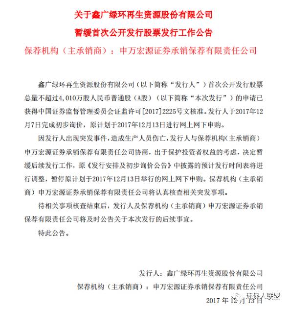 12月13日,鑫广绿环再生资源股份有限公司(鑫广绿环,603302)公告称,该公司原计划于2017年12月13日进行网上网下申购。因发行人出现突发事件,造成生产人员伤亡,发行人与保荐机构(主承销商)申万宏源证券承销保荐有限责任公司协商,出于保护投资者权益的考虑,决定暂缓后续发行工作。