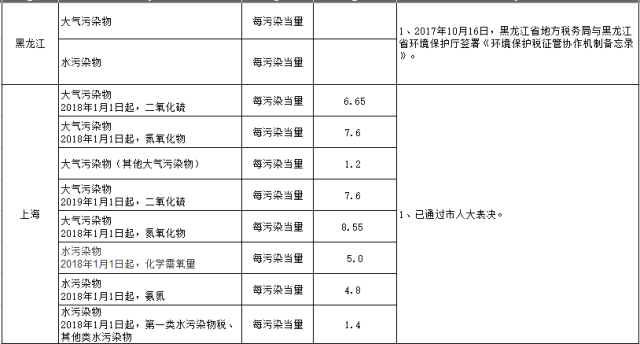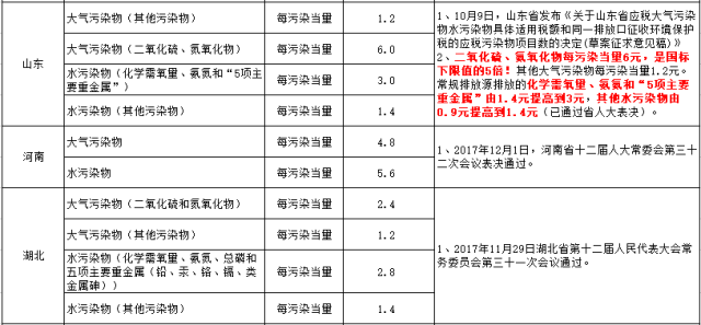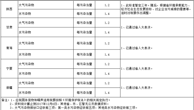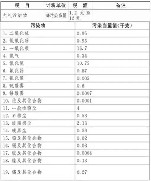 应税大气污染物适用税额为每污染当量1.2元,应税水污染物适用税额为每污染当量1.4元。(已通过省人大表决)
