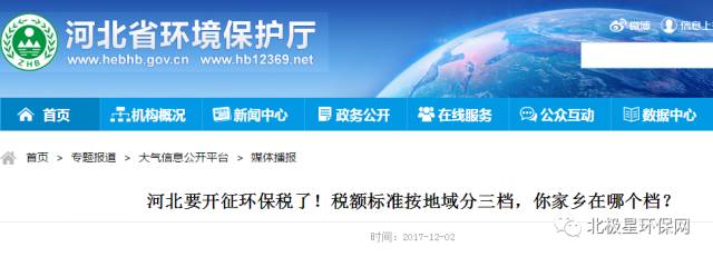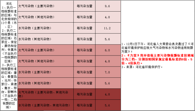 12月1日下午,河北省人大常委会表决通过了《河北省环境保护税应税大气污染物和水污染物适用税额方案》,方案将于2018年1月1日起施行,《方案》将环保税主要污染物税额标准按地域分为三档,分别按照国家规定最低标准的8倍、5倍、4倍执行。