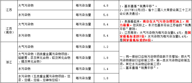 大气污染物和水污染物中的主要污染物征收标准分别是每污染当量4.8元和5.6元。基本遵循“税费平移”。而江苏南京,大气污染物为每污染当量8.4元,是国家最低标准的7倍;水污染物为每污染当量8.4元,是国家最低标准的6倍。