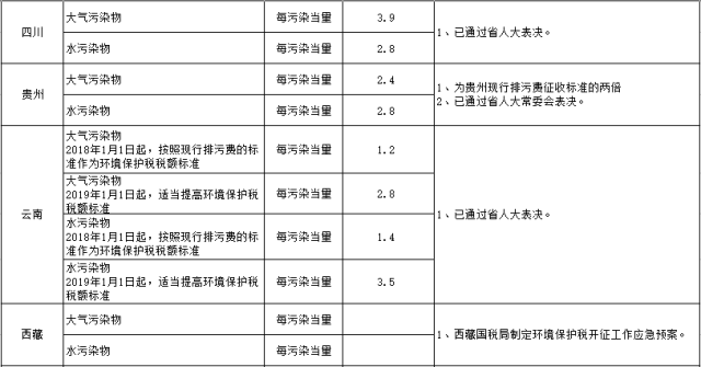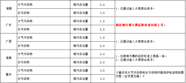 大气污染物拟定税额标准为1.2元/污染当量,水污染物拟定税额标准为1.4元/污染当量。(已通过省人大表决)