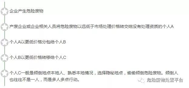 危险废物非法倾倒案大多具有团伙作案、里应外合、层层分包转移的特点,从生产到倾倒一般有三四个环节。现在来做一个总结: