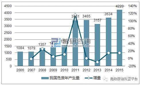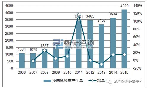 危险废物产生量与生产危废行业的发展密切相关,分析了产生危废前 4 位行业的 11-14 年总产值及复合增速走势,非金属矿采选业、化学原料及化学品制造业、造纸及纸制品业、有色金属冶炼及压延加工业,四种行业复合增速分别是 13.33%、7.87%、3.34%、6.48%,高于同期工业总产值的复合增速 5.15%,预计我国危废产生量将与这 4 个行业的增速保持一致,考虑到我国当前经济增速放缓 的形势,大约在 6%-8%之间。2015 年我国工业危废产生量达到 4220 万吨,预计按照每年 8%的增长,2020 年危废产量将达到 6200 万吨。按照危废平均处理价格为 3000 元/吨测算,在 2020 年达到 1860 亿元的产值,考虑到过去已经存在的待处理的危废存量,预计有 2000 亿的市场空间。来源:中国产业信息网